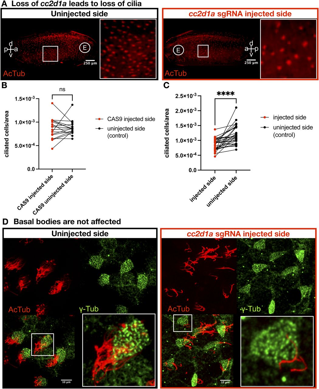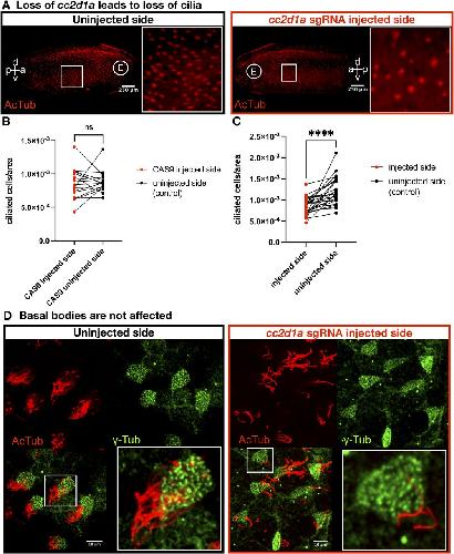 (A) cc2d1a was knocked down on the one side of a two-cell stage embryo, which was grown to st.28 and stained with AcTub. The left panel shows the uninjected side, and the right panel shows the cc2d1a-depleted side. Zoomed-in images show a section of the epidermis with ciliated cells. Scale bar = 250 μm. a, anterior; p, posterior; d, dorsal; v, ventral; E, eye. (B) Quantification of ciliated cells/area in embryos injected with Cas9 only on the one side at the two-cell stage. Paired t test; ns, not significant. (C) Quantification of ciliated cells/area in embryos injected with cc2d1a sgRNA with Cas9 on the one side at the two-cell stage. Paired t test; P < 0.0001 (****). (D) Immunofluorescence images of one-of-two cell-injected st.28–30 embryos stained with anti-AcTub (red) and anti-γ-Tub (green), with merge (bottom left). cc2d1a-injected side (red box), compared with the control-uninjected side, shows that cc2d1a KO leads to loss of cilia, but basal bodies are unaffected. Scale bar = 10 μm.
