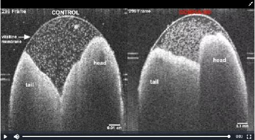 Video 1.Epidermal cilium-driven fluid flow (30 fps). OCT-captured Videos of st.28–30 unhatched embryos showing fluid flow generated by epidermal cilia in the control embryo (left panel) and loss of fluid flow because of compromised cilia in the cc2d1a mutant embryo (right panel). The head, tail, and vitelline membrane are labeled. |