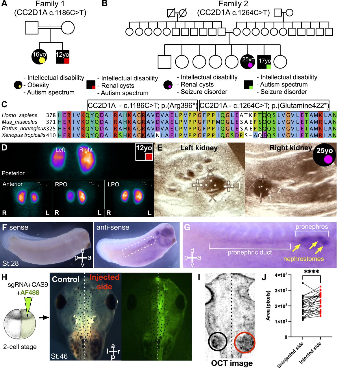 (A, B) Pedigrees and clinical presentation of four individuals from two unrelated families with homozygous mutations in CC2D1A, presenting with intellectual disability, autism, obesity, renal cysts, and/or seizures. Symbols are as follows: filled, affected; empty, unaffected; circle, female; square, male; yellow circle, 16-yr-old female from Family#1; red square, 12-yr-old male from Family#1; purple circle, 15-yr-old female from Family#2; green square, 17-yr-old male from Family#2; double bars, consanguinity in the family; hash, deceased. Abbreviations: yo, year old. (C) Alignment of the CC2D1A amino acid sequence from the human, mouse, rat, and frog shows high conservation across all species tested. The locations of the identified mutations are shown. (D) Renal ultrasonography of the 12-yr-old male patient from Family#1 at 8 mo of age shows cortical renal cysts (four cystic lesions). l, left; r, right; RPO, right posterior oblique; LPO, left posterior oblique. (E) Renal ultrasonography of the 25-yr-old female patient from Family#2 shows bilateral cystic lesions. (F) Whole-mount in situ hybridization on WT X. tropicalis embryos at st.28 with antisense (left image) and sense (right image) probes against cc2d1a mRNA. a, anterior; p, posterior; d, dorsal; v, ventral; st., stage. (G) Zoomed-in image shows strong cc2d1a expression in the pronephric duct and pronephros. Yellow arrows point to the nephrostomes, which are precursors to the kidneys. (H) Schematic of a one-of-two cell injection with cc2d1a sgRNA, Cas9, and Dextran, Alexa Fluor 488 dye. The embryos were raised to st.46, and with fluorescence microscopy, we verified that only one side was injected (shown in green). The non-fluorescent side serves as the internal control. r, right; l, left; a, anterior; p, posterior. (I) Representative 3D image of a st.46 Xenopus embryo, ventrally imaged using OCT. The right side, depleted of cc2d1a, exhibited larger kidneys (as shown in the red circle). OCT, optical coherence tomography. (J) Quantification of kidney cross-sectional area in the uninjected versus injected side in n = 28 embryos. Red and black dots indicate injected and uninjected side embryos, respectively. Paired t test; **** indicates P < 0.0001. |