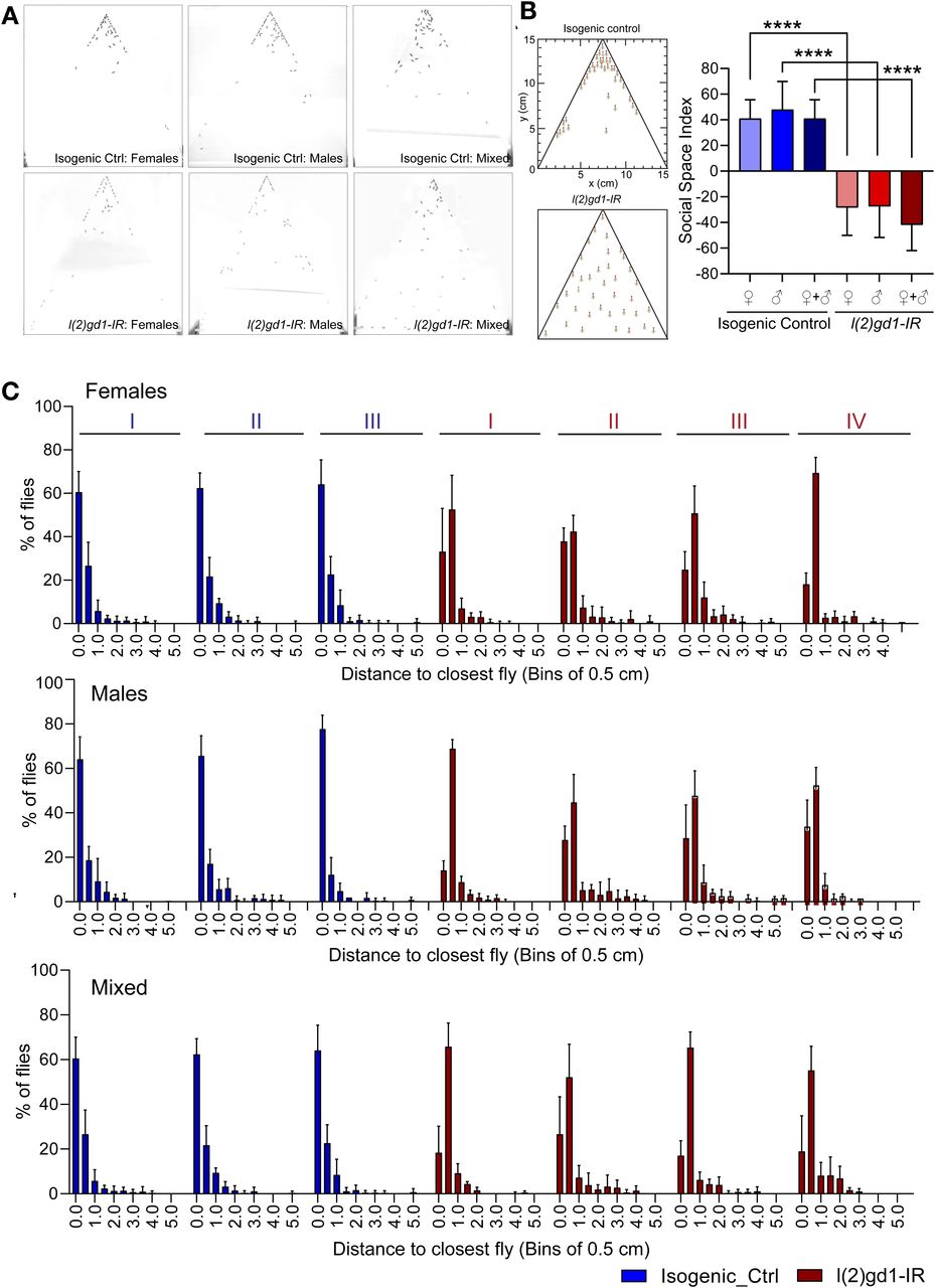 (A) Representative images showing the segregation of act>l(2)gd1-IR and isogenic control flies in the social space behavioral assay. (B) Cartoon representation of the segregation pattern of control and act>l(2)gd1-IR flies in the social space assay. Graphical representation of the quantification of social space between the flies, computed in bins of 0.5 cm. Data are shown as the SSI. (C) Graphs represent the percentage of flies (±SEM) at the different distances from their closest neighbor, using bins of 0.5 cm. The assay was performed in triplicates in three or four independent repeats for isogenic controls and act>l(2)gd1-IR, respectively. The histograms between the two differ significantly (Kolmogorov–Smirnov test, P < 00001).
