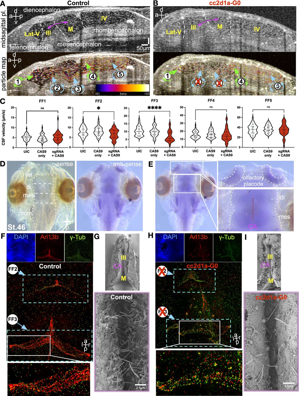 (A, B) OCT-captured midsagittal section of st.46 control (A) and cc2d1a mutant (B) tadpole brains. White lettering and dotted white lines indicate brain regions; the brain ventricular system is labeled in yellow, and pink arrows indicate the location of the cerebral aqueduct. Ventricular CSF circulation was determined by particle tracking map in the control st.46 tadpole brain and the cc2d1a mutant tadpole brain. Green arrows indicate clockwise flow in the FF1 region and the FF4 region, whereas blue arrows indicate anti-clockwise fluid flow in FF2, FF3, and FF5. Compromised CSF flow in the cerebral aqueduct is indicated by the red X. Scale bar = 50 μm. Temporal color coding illustrates particle trajectory over time. The color scale bar shows the correspondence between the color and frame number in the color-coded image. a, anterior; p, posterior; d, dorsal; v, ventral; Lat-V, lateral ventricle; III, third ventricle; M, midbrain ventricle; IV, fourth ventricle. (C)Quantification of CSF flow velocities in UIC, Cas9 control, and cc2d1a mutant L-looped tadpoles, measured in μm/s, indicates slower FF2 and FF3 (cerebral aqueduct region) velocities in cc2d1a mutant L-looped tadpoles. ns, not significant; P < 0.05 (*), P < 0.0001 (****). CA, cerebral aqueduct; CSF, cerebrospinal fluid. (D, E) Whole-mount in situ hybridization on dissected WT X. tropicalis embryo brains at st.45 with antisense (right image) and sense (left image) probes against cc2d1a mRNA (D). (E).Cc2d1a is expressed in the diencephalon and mesencephalon transition zone, surrounding the cerebral aqueduct (E). a, anterior; p, posterior; d, dorsal; v, ventral; tel, telencephalon; di, diencephalon; mes, mesencephalon; rhom, rhombencephalon; CA, cerebral aqueduct; st., stage. (F) Immunofluorescence images of dissected st.46 control stained with DAPI (top left in blue), anti-Arl13b (red, top middle), and anti-γ-Tub (green, top right). The bottom shows merged images of Arl13b and γ-Tub. (G) SEM images of the ventral ependymal surfaces of st.46 control. (H) Immunofluorescence images of dissected st.46 cc2d1a mutant tadpole brains. In the cc2d1a mutant brains, cilia in the cerebral aqueduct region are compromised, leading to slower CSF flow in FF2 and FF3 (light blue boxes). (I) SEM images of the ventral ependymal surfaces of st.46 cc2d1a mutant tadpole brains in the CA region showing vastly reduced ciliary density. a, anterior; p, posterior; l, left; r, right; FF, flow field; CA, cerebral aqueduct; III, third ventricle; M, midbrain ventricle.