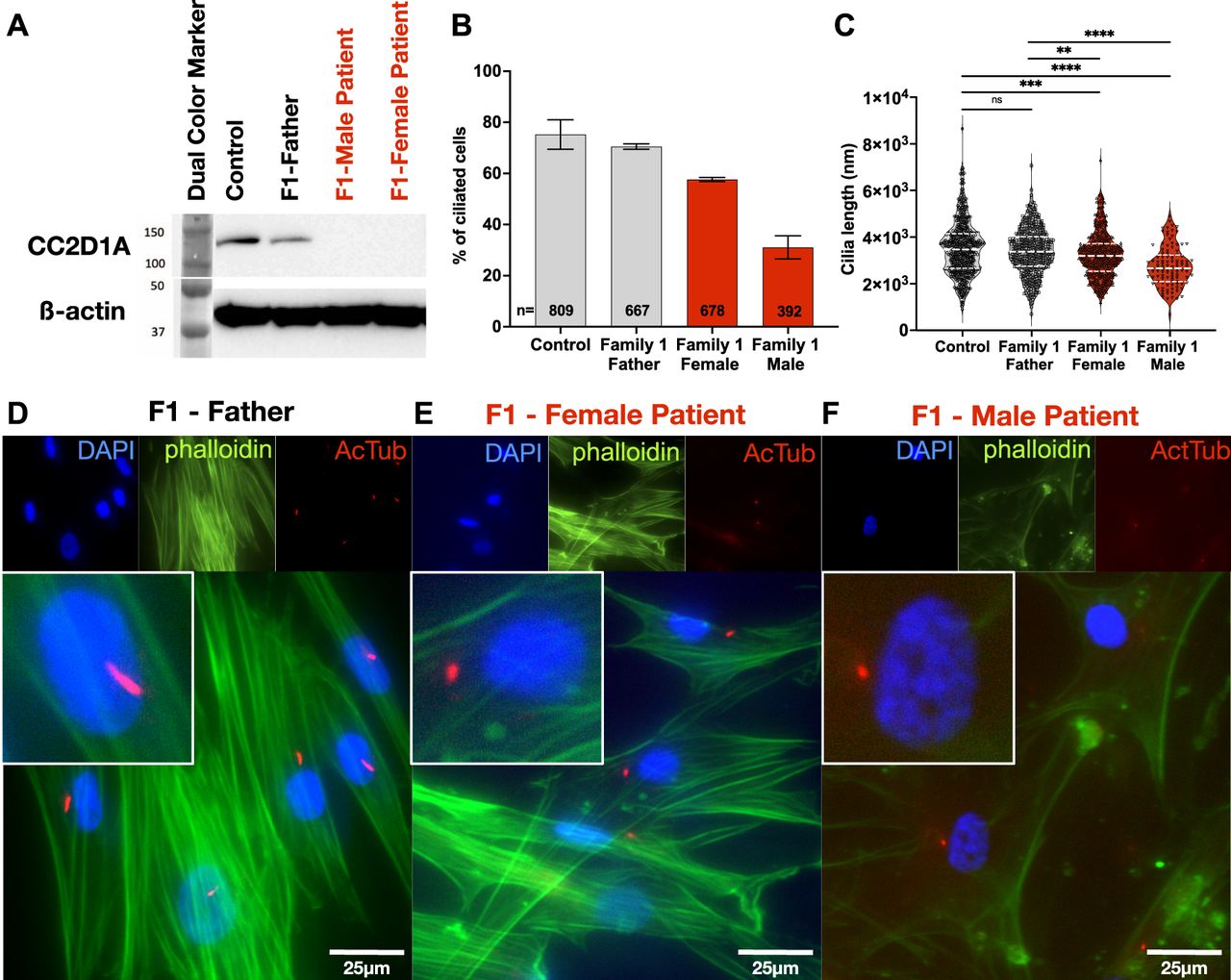 (A) Western blot of fibroblast cell line lysates from control, and Family#1 father, female patient, and male patient. The affected patient cell lines did not show detectable CC2D1A expression. (B, C) Quantification of fibroblast starvation–induced ciliary length. The patients displayed fewer ciliated cells or shorter ciliary lengths. ns, not significant; P < 0.01 (**), P < 0.0001 (****). (D, E, F) Cultured and starved fibroblasts from Family#1 father, female patient, and male patient stained with DAPI (blue) to show nuclei, phalloidin, Alexa Fluor 488 (green) to show actin cytoskeleton, and anti-acetylated tubulin (red) to show ciliary axonemes. Cilia on the patient fibroblasts were less frequent and shorter than those on the control and father fibroblasts. Scale bar = 25 μm. |