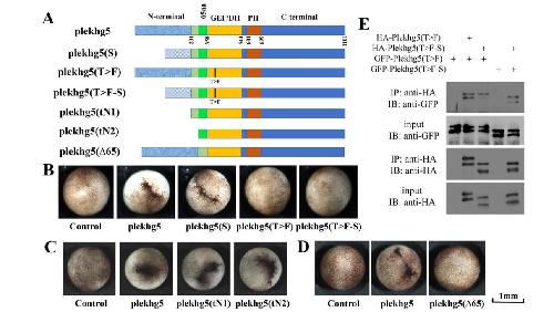 Figure 1. Both long and short isoforms of Plekhg5 induce apical constriction and can self-associate. A) Schematic representation of Plekhg5 isoforms, T>F mutants, and the deletionmutants. The long isoform corresponds to the NCBI protein with the accession numberXP_018083458, whereas the short isoform has the accession number of XP_018083456. B)Induction of apical constriction by the wild-type (total 0.1 ng RNA), but not the T>F mutants(total 1 ng RNA), plekhg5 isoforms. The experiment was repeated three times, with the totalnumber of embryos displaying apical constriction as follows: control, 0/28 embryos; 0.1 ngplekhg5, 28/28 embryos; 0.1 ng plekhg5-S, 28/28 embryos; 1 ng plekhg5(T>F), 0/39 embryos;and 1 ng plekhg5(T>F-S), 0/33 embryos. C) Removal of the divergent N-terminal sequences inthe isoforms (tN1 mutant) and including the first 44 amino acids in the overlapping region upstream of the GEF/DH domain (tN2 mutant) does not impair the ability of the mutants toinduce apical constriction. The experiment was repeated three times, with the total number ofembryos displaying apical constriction as follows: control, 0/42 embryo; 0.1 ng plekhg5, 23/23embryos; 0.1 ng plekhg5(tN1), 44/44 embryos; and 0.1 ng plekhg5(tN2), 51/51 embryos. D)Deletion of the 65 amino acids in the region common to long and short isoforms upstream of theGEF/DH domain leads to loss of induction of apical constriction by the mutant. The experimentwas repeated three times, with the total number of embryos displaying apical constriction asfollows: control, 0/38 embryos; 0.1 ng plekhg5, 26/26 embryos; and 1 ng plekhg5(65), 0/45embryos. E) Both long and short isoforms of Plekhg5 can self-associate. HA- and GFP-taggedPlekhg5(T>F) or Plekhg5(T>F-S) were co-expressed at the RNA doses of 0.5 to 1 ng for eachgene in early Xenopus embryos. Co-IP studies were performed using embryonic lysate obtainedat gastrula stages. Co-IP signals were detected by Western blot analysis. The experiment wasrepeated three times. IP: immunoprecipitation; IB: immunoblotting. |