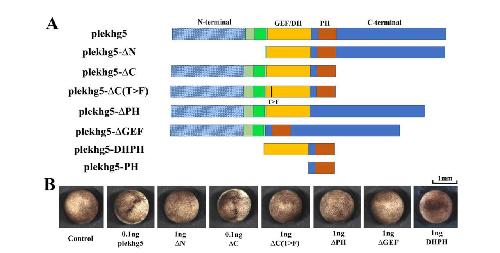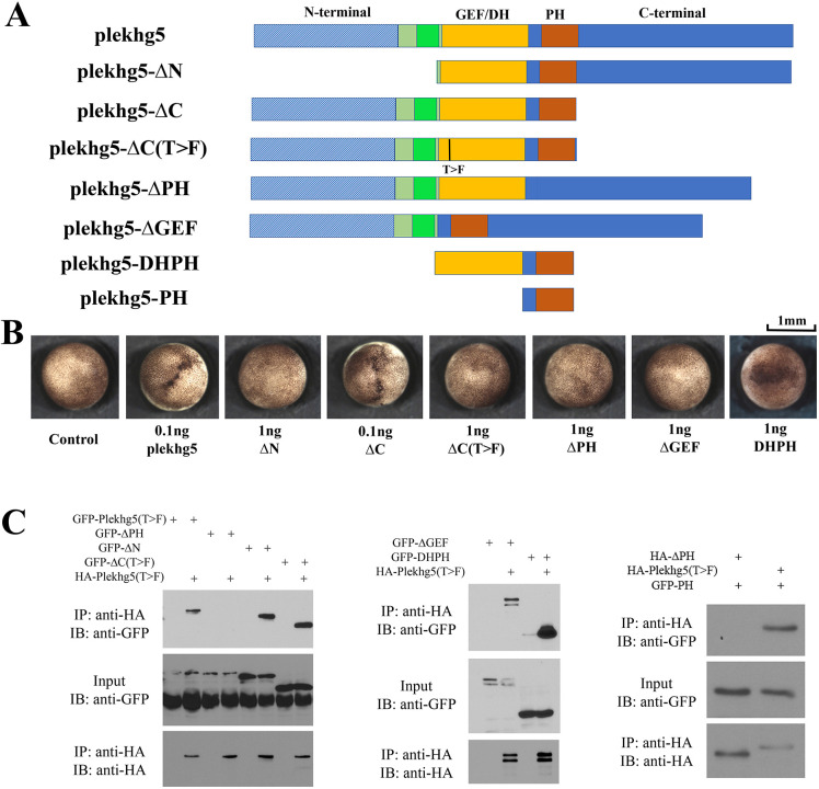 Figure 2. The PH domain is critical for Plekhg5 self-association. A) Schematicrepresentation of the deletion mutants used in the co-IP assay. B) The deletion mutants havedifferent abilities to induce apical constriction. While removal of the C-terminal sequences (Cmutant) does not impair the ability of the mutant to induce apical constriction, deletion of theother domains leads to reduction (in the case of the DHPH mutant) or loss of induction of apicalconstriction by the mutants. The experiments were repeated three to five times, with the totalnumber of embryos displaying apical constriction as follows: control, 0/44 embryos; 0.1 ngplekhg5, 61/61 embryos; 1 ngN, 0/39 embryos; 0.1 ngC, 61/61 embryos; 1ngC(T>F), 0/60embryos; 1 ngPH, 0/39 embryos; 1 ngGEF, 0/51 embryos and 1 ng DHPH, 35/72 embryoswith weak constriction. C) Left panel: the co-IP studies indicate that deletion of the PH domainabolishes Plekhg5 self-association whereas deletion of the other domains does not affect association of the mutants with Plekhg5(T>F). Middle panel: deletion of the GEF/DH domaindoes not affect binding of the mutant to Plekhg5(T>F), and the isolated DHPH domain issufficient for association of the mutant with Plekhg5(T>F). Right panel: the isolated PH domainis capable of binding to Plekhg5(T>F), but not the Plekhg5 mutant with the PH domain removed.The experiments were repeated three times. |