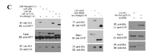 Supplemental Figure 4. Specificity of PH domain-mediated association of RhoGEFs. Coimmunoprecipitation assay was performed to examine interactions of Plekhg5(T>F) with the GFP-tagged PH domains from Plekhg5, Plekhg6, and Arhgef2 (a.k.a. GEF-H1). While Plekhg5(T>F) can interact with the PH domains of Plekhg5 and Plekhg6, it does not bind the PH domain of Arhgef2, indicating that PH domain-mediated association of RhoGEFs is specific to a subset of the family members. |