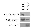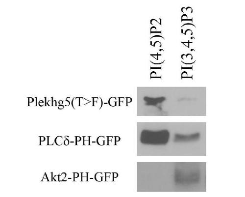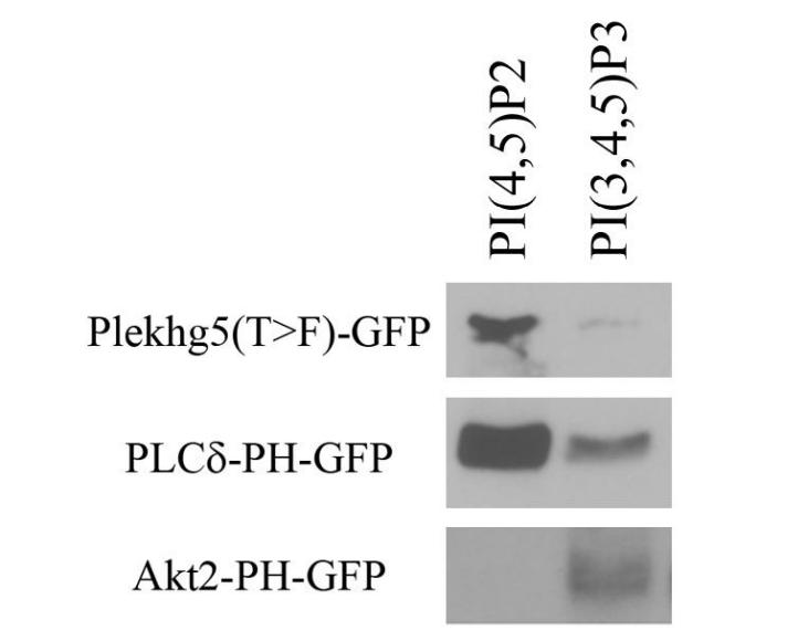 Supplemental Figure 5. Plekhg5 binds preferentially to the apically enriched phospholipid PI(4,5)P2. The PI(4,5)P2 and PI(3,4,5)P3 phospholipid-conjugated beads (Echelon Biosciences) were used to pulled down GFP-tagged Plekhg5(T>F) from protein extract from Plekhg5(T>F)- injected embryos at gastrula stages. GFP-tagged PH domains from PLC and Akt2 were used as positive controls for preferential binding to apically or basolaterally enriched phospholipids PI(4,5)P2 and PI(3,4,5)P3, respectively. Plekhg5(T>F) preferentially binds to the apically enriched PI(4,5)P2. |
