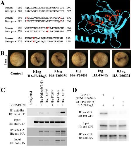 Figure 6. The PH mutants corresponding to those identified in human PLEKHG5 disease-associated variants have different abilities to induce apical constriction or self-associate. A)Sequence alignment between human and Xenopus proteins demonstrates conservation of theresidues found in disease-associated human variants in the PH domain. These residues are foundin the beta-sandwiches or the loop regions in the predicted structure of the PH domain based onthe AlphaFold model. B) Distinct abilities of the Xenopus mutants corresponding to the humanvariants in inducing apical constriction. While the T609M and the T663M mutants retained theirability to induce apical constriction, the P630H and F647S mutants showed severe reduction in inducing apical constriction. The experiments were repeated four times, with the total number ofembryos displaying apical constriction as follows: control, 0/78 embryos; 0.1 ng HA-plekhg5,50/50 embryos; 0.1 ng HA-T609M, 75/77 embryos; 1 ng HA-P630H, 5/73 embryos; 1ng HA-F647S, 0/72 embryos; and 0.1 ng HA-T663M, 88/88 embryos. C) The co-IP assay reveals thatthe P630H mutant is less stable than the wild-type protein and the F647S mutant fails toassociate with the GFP-tagged DHPH domain of Plekhg5. The RNA doses used were: 1 ngGFP-DHPH; 2 ng HA-P630H; and 0.5 ng all the rest of the HA-tagged Plekhg5 mutants. Theexperiment was repeated three times. D) Unlike the wild-type PH domain of Plekhg5, theisolated PH domains of P630H and F647S mutants cannot bind to Plekhg5. The experiment wasrepeated twice. |