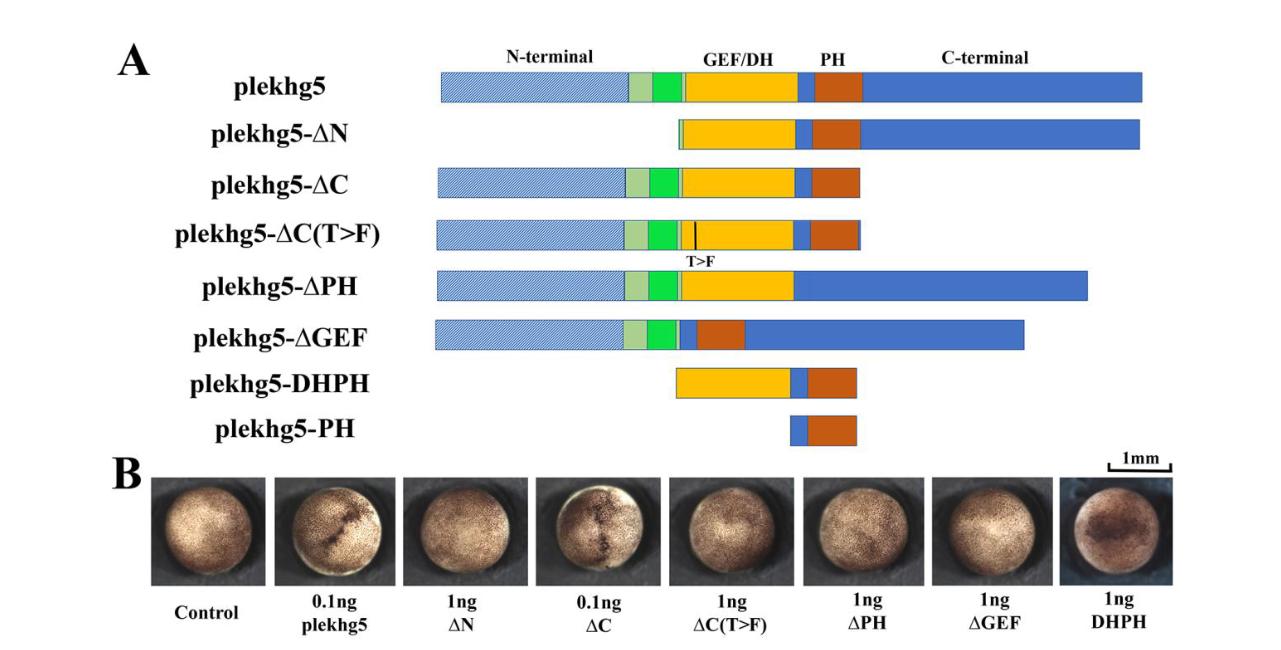 RhoGEFs are critical activators of Rho family small GTPases and regulate diverse biological processes, such as cell division and tissue morphogenesis. We reported previously that the RhoGEF gene plekhg5 controls apical constriction of bottle cells at the blastopore lip during Xenopus gastrulation, but the detailed mechanism of plekhg5 action is not understood in depth. In this study, we show that localization of Plekhg5 in the apical cortex depends on its N-terminal sequences and intact guanine nucleotide exchange activity, whereas the C-terminal sequences prevent ectopic localization of the protein to the basolateral compartment. We also reveal that Plekhg5 self-associates via its PH domain, and this interaction leads to functional rescue of two mutants that lack the N-terminal region and the guanine nucleotide exchange factor activity, respectively, in trans. A point mutation in the PH domain corresponding to a variant associated with human disease leads to loss of self-association and failure of the mutant to induce apical constriction. Taken together, our results suggest that PH-mediated self-association and N-terminal domain-mediated subcellular localization are both crucial for the function of Plekhg5 in inducing apical constriction.
