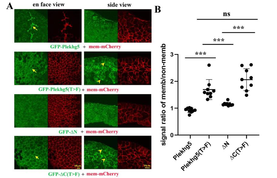 Figure 3. Localization of Plekhg5 and its mutants. A) GFP-tagged Plekhg5 and its mutantswere co-expressed with membrane-tethered mCherry (mem-mCherry) in the animal cells of earlyembryos. Examination of protein localization at early gastrula stages indicates that wild-typePlekhg5 accumulates under the apical membrane, whereas the T>F mutant is moderatelyenriched at the cell junction. Deletion of the C-terminal region enhances junctional recruitmentof the C(T>F) mutant as well as its ectopic localization to the basolateral compartment of outerepithelial cells and cell-cell contacts of the inner cells. Deletion of the N-terminal sequenceresults in more diffuse distribution of the N mutant. The experiments were repeated three timesfor en face view samples and twice for side view samples, with the total number of imagedembryos as follows: 0.1-0.2 ng GFP-Plekhg5, 14 en face view and 6 side view samples; 0.2-0.5ng GFP-Plekhg5(T>F), 13 en face view and 12 side view samples; 0.5 ng GFP-N, 13 en face view and 14 side view samples; and 0.5 ng GFP-C(T>F), 13 en face view and 12 side viewsamples. Arrows indicate signals under the apical surface of plekhg5-expressing cells orenriched at the cell junctions of cells expressing plekhg5(T>F) orC(T>F) in the en face view,whereas arrowheads point to ectopic signals in the basolateral compartment of outer epithelialcells and at the cell-cell contacts of inner cells in the side view. B) Quantification of GFP signalsat cell contacts versus in the non-junctional areas in samples with en face views support theobservation of junctional enrichment of the T>F mutants. A total of 9 samples from threeexperiments were analyzed for each sample group. *** indicates p-value less than 0.001, and nsmeans non-significant with the p-value = 0.06 between the indicated groups. |