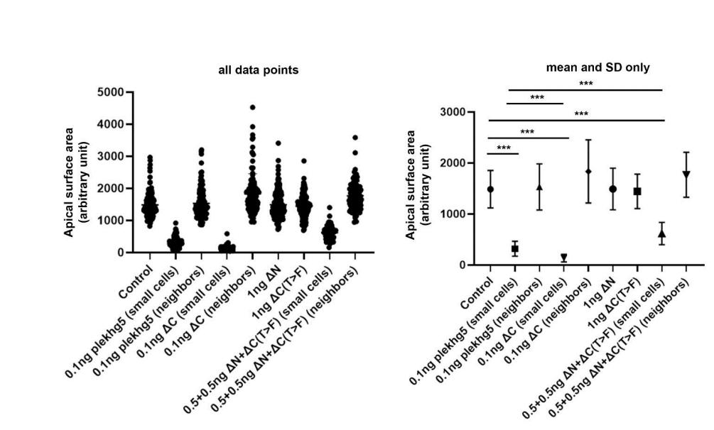 Supplemental Figure 1. Plekhg5 and its mutants show different time course and efficiency in induction apical constriction. When injected at the same RNA doses of 0.1 ng, the C mutant induced reduction of apical cell surface more efficiently than the wild-type plekhg5 did. In addition, while embryos injected with either N or C(T>F) mutant at the 1 ng RNA dose did not show apical constriction phenotype, combined injection of the two mutants at 0.5 ng RNA dose for each mutant was sufficient to restore apical constriction, though this occurred with less efficiency than that induced by wild-type plekhg5. The number of the embryos analyzed was described in the figure legends in the main manuscript. |
