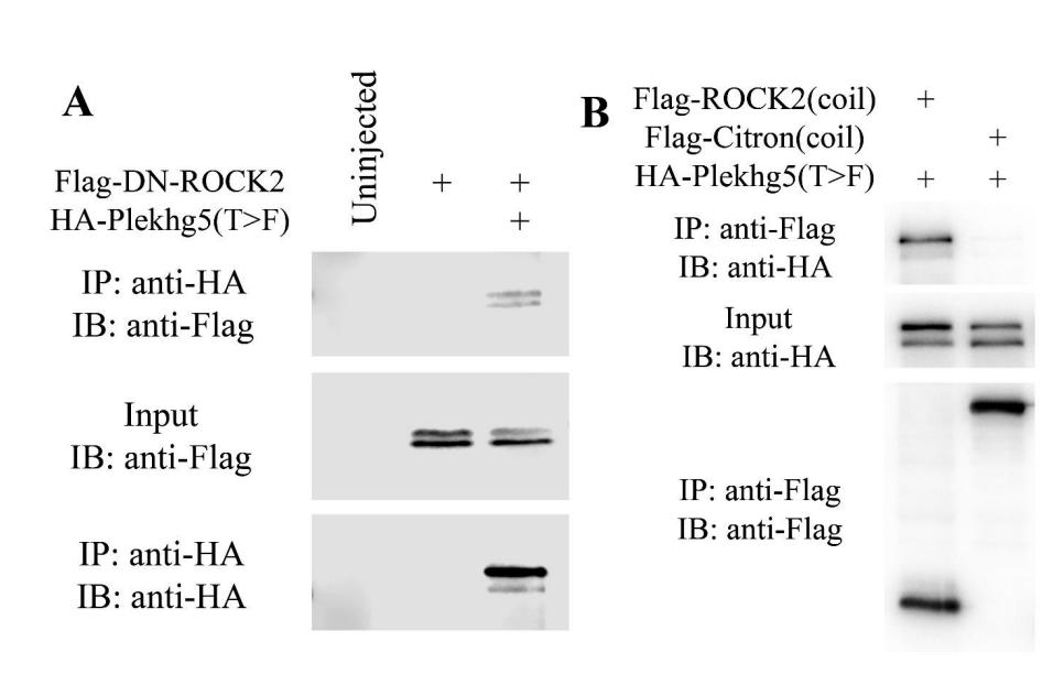 Supplemental Figure 6. Plekhg5 interacts with the Rho effector ROCK. A) Coimmunoprecipitation (IP) assay performed with HA-Plekhg5(T>F) and Flag-tagged dominant negative ROCK2 (Flag-DN-ROCK2), which contains the coiled-coil, PH and C1 domains of ROCK2, showed that Plekhg5 could pull down DN-ROCK2. B) Co-IP assay with HAPlekhg5(T>F) and Flag-tagged partial coiled-coil domain from ROCK2 or entire coiled-coil region, predicted by the AlphaFold algorithm, of human CITRON (Flag-CIT), another Rho effector, reveals that Plekhg5 interacts with the coiled-coil sequence of ROCK2 but not that of CITRON. The result implies selective interaction of Plekhg5 with a subset of Rho effectors. |