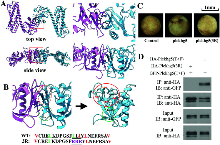 Figure 5. Computational modeling of Plekhg5 DH/PH domains as a dimer. A) Homologymodeling based on the structure of Arhgef11 reveals PH-mediated dimerization of the DH andPH domains of Plekhg5. B) Two groups of amino acids (red and green) are identified to bepotentially important for self-association at the DH/PH dimer interface. Mutagenesis of 3hydrophobic residues into charged arginine is indicated in the sequence. C) The 3R mutantcannot induce apical constriction. The experiment was repeated three times, with the totalnumber of embryos displaying apical constriction as follows: control, 0/24 embryos; 0.1 ngplekhg5, 32/32 embryos; 1 ng plekhg5(3R), 0/40 embryos. D) When expressed at the similarprotein level to Plekhg5(T>F), with RNA doses of 0.5 ng HA-plekhg5(T>F) and 2 ng HA-plekhg5(3R), the 3R mutant fails to self-associate in the co-IP assay. The experiment wasrepeated three times. |