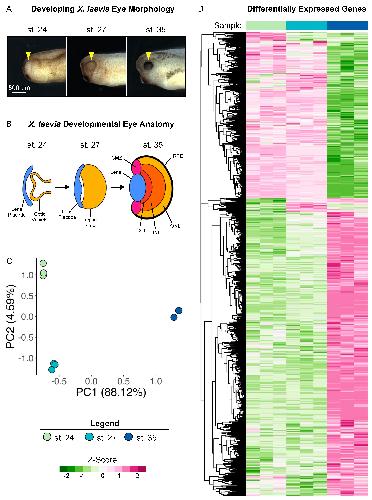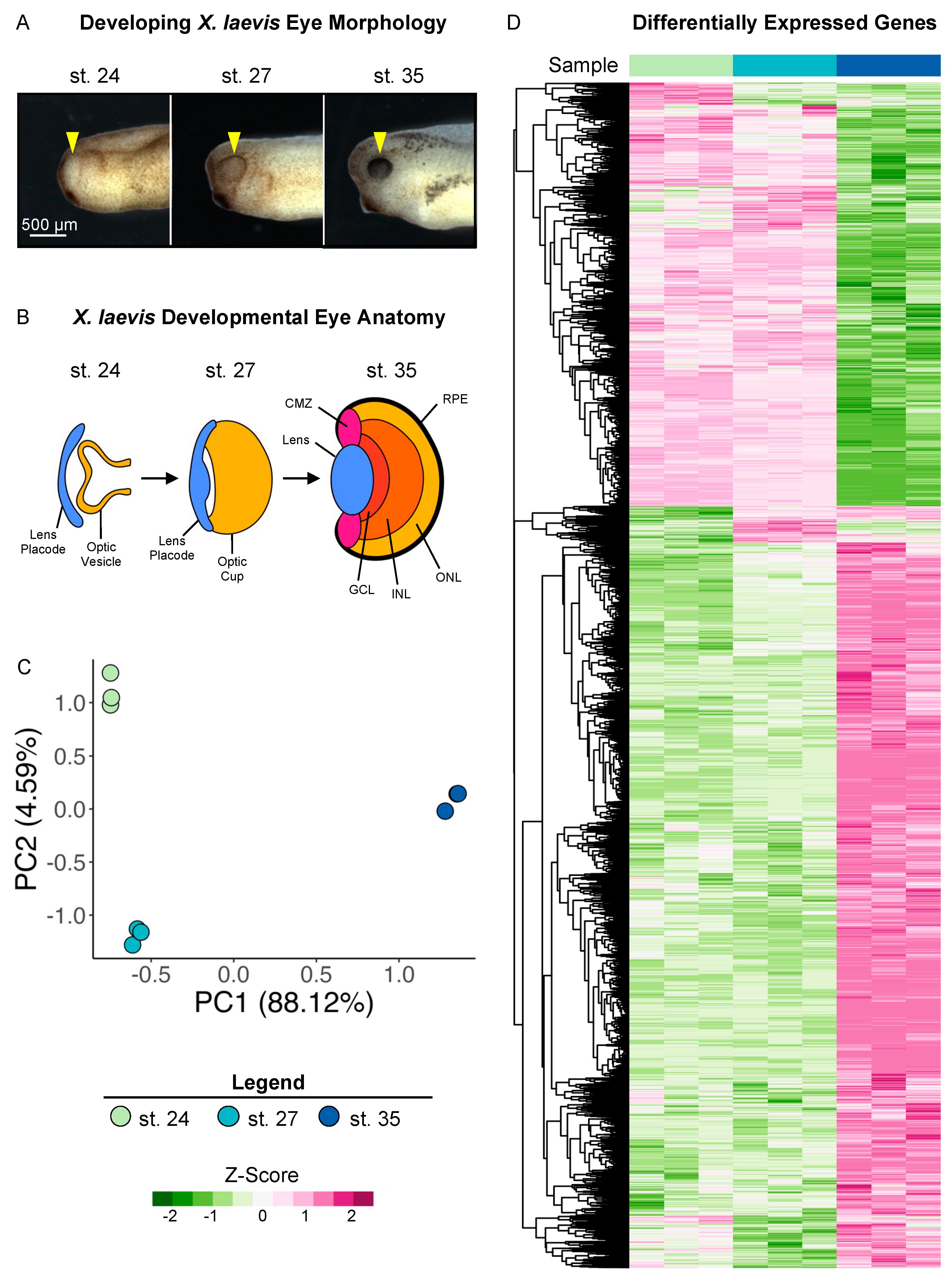Figure 1. Transcriptional analysis of developing optic tissues. (A) X. laevis embryos at NF stages (st.) 24, 27, and 35, indicating the tissue that was resected for RNA sequencing and transcriptional analysis (yellow arrowhead). Scale bar: 500 μm. (B) Major optic structures present at each developmental stage assayed by RNA sequencing. CMZ: ciliary marginal zone; GCL: ganglion cell layer; INL: inner nuclear layer; ONL: outer nuclear layer; RPE: retinal pigmented epithelium. (C) Principal component analysis of whole transcriptome expression with triplicate samples for each developmental stage assayed. PC1: 88.12%, PC2: 4.95. (D) Relative expressions (Z-score vst counts) of statistically significantly differentially expressed genes between three developmental stages (st. 27 vs. 24 and st. 35 vs. 27). Rows are ordered by hierarchical clustering. Columns are ordered by stage.