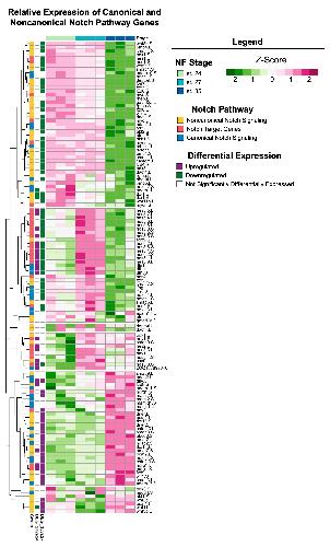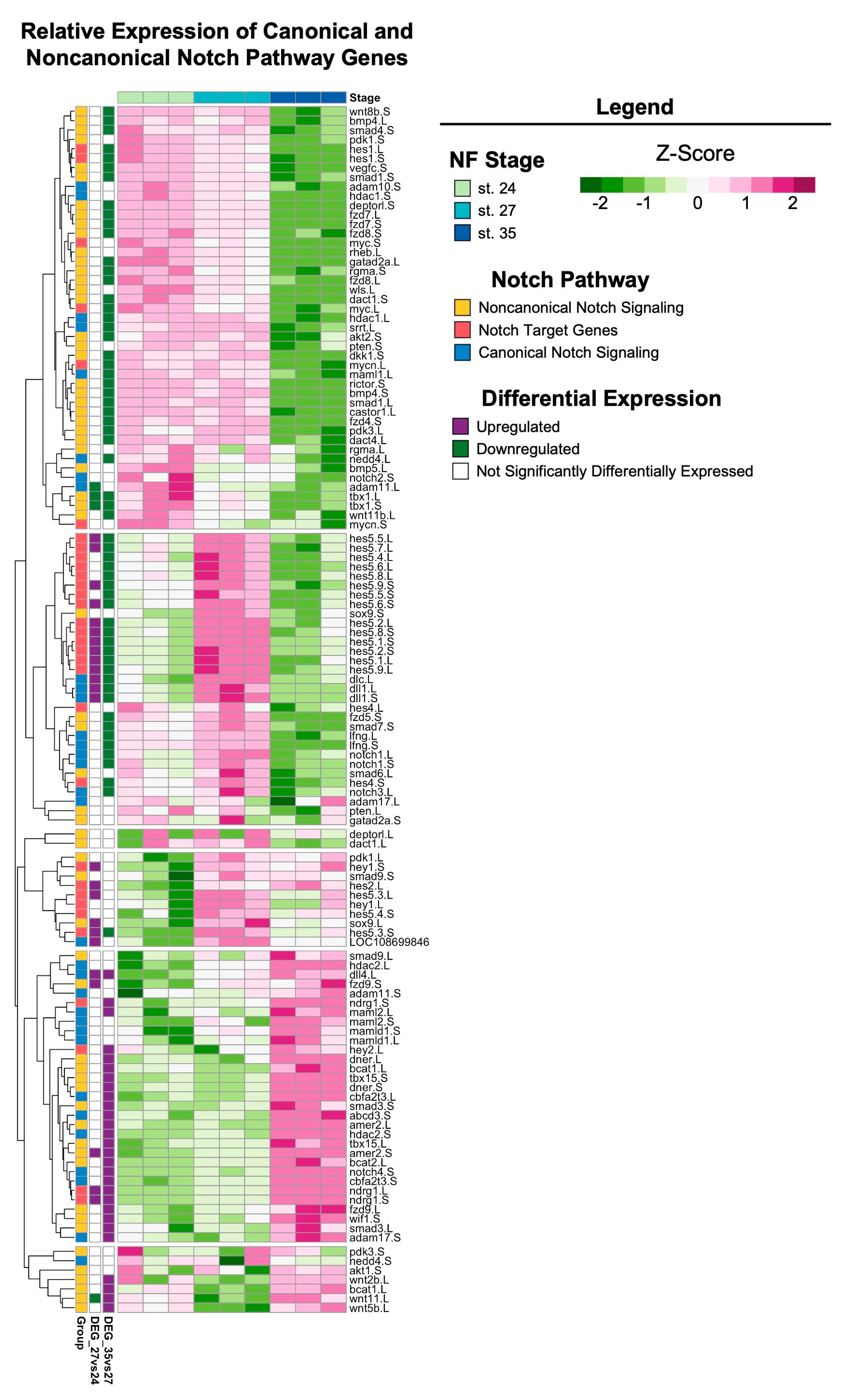 Figure 6. Notch signaling across retinal development. Relative expression (Z-score vst counts) of known Notch pathway genes (including genes that participate in canonical and noncanonical signaling, as well as downstream target genes) at st. 24, 27, and 35. Rows are ordered by hierarchical clustering and columns are ordered by stage. Genes identified in the differential expression analysis (genes with FDR adj. p < 0.05 and absolute log2 fold change ≥ 1) between consecutive developmental stages are displayed to the left (purple: upregulated; green: downregulated; white: not differentially expressed).