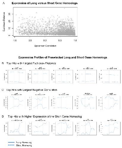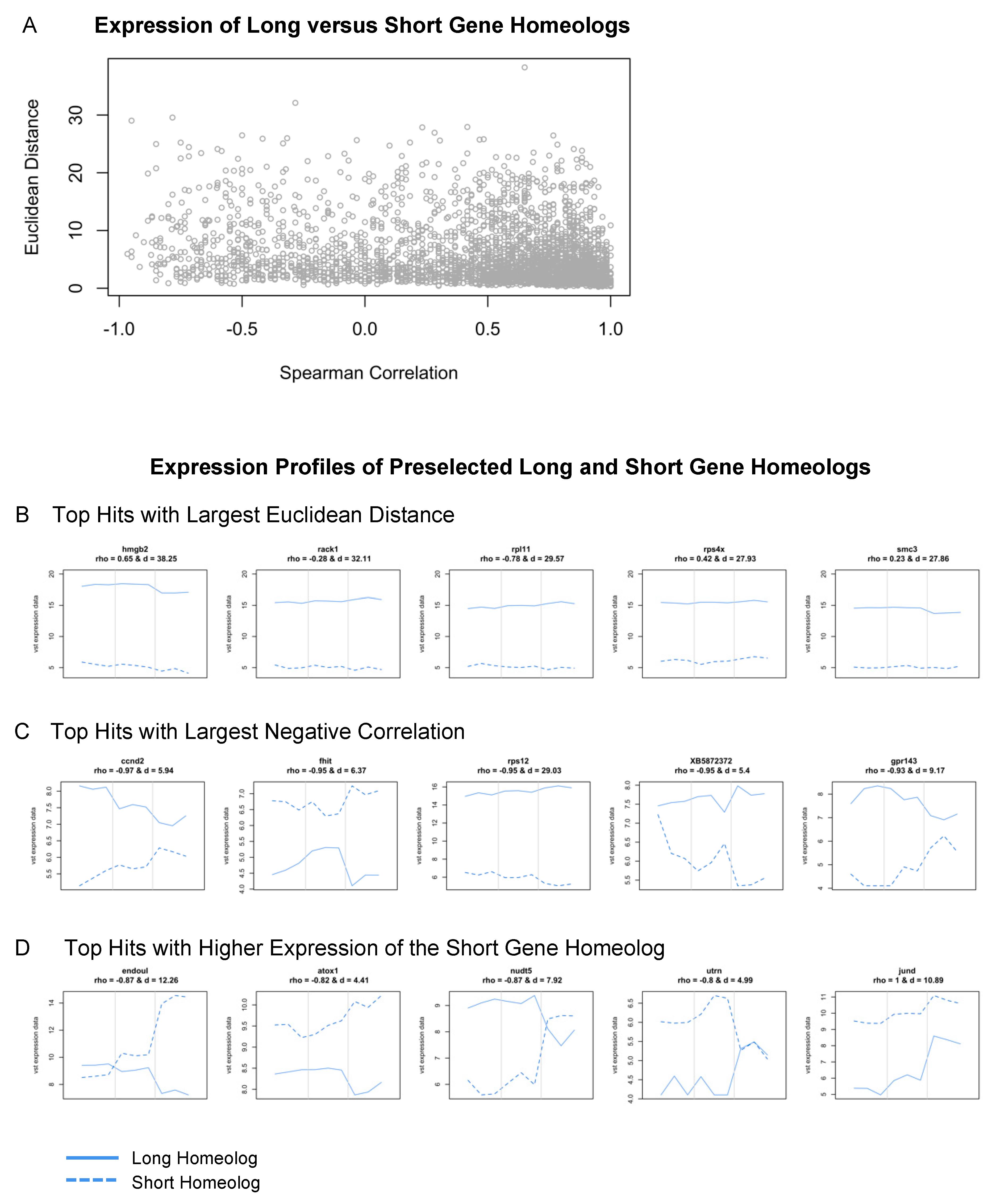 Figure 7. Expression analysis of long and short gene homeologs across retinal development. (A) Scatterplot of Spearman’s correlation coefficient versus the Euclidean distance of L and S homeologs. (B–D) Expression profiles (vst counts) of selected hits identified in (A). Homeologs with (B) largest Euclidean distance (the largest expression difference across developmental stages), (C) highest negative correlation (behaving most differently across developmental stages), and (D) short gene homeologs with higher expression than their long homeolog. Dashed lines: Expression of the short homeolog. Solid lines: Expression of the long homeolog. The Spearman’s correlation coefficient (rho) and Euclidean distance (d) for homeologs are displayed at the top of the corresponding expression profiles.