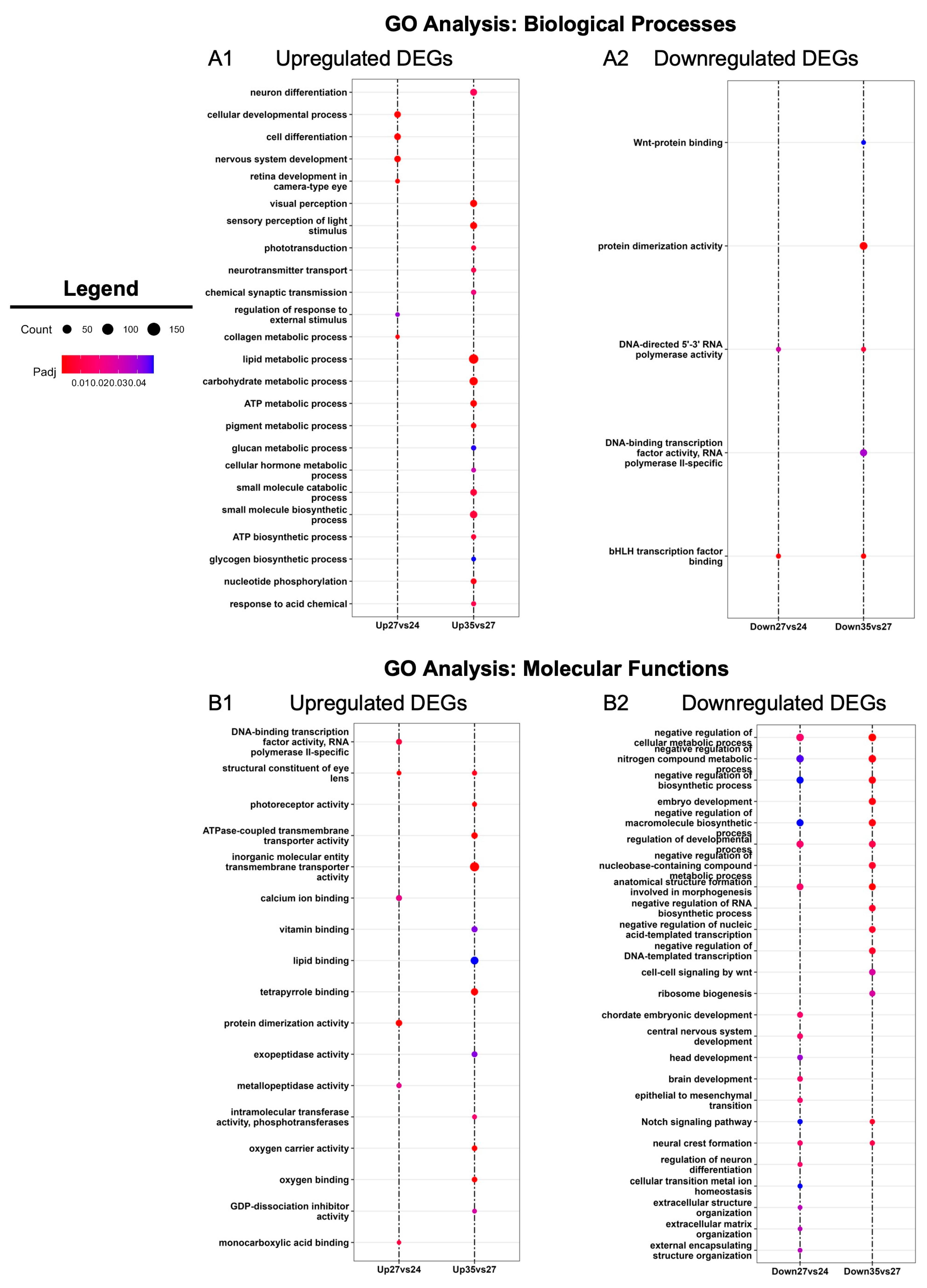 Figure 3. GO enrichment analysis. Gene Ontology (GO) analysis of statistically significantly differentially expressed genes (absolute log2 fold change ≥ 1 and FDR adj. p < 0.05) between consecutive developmental stages (st. 27 vs. 24 and st. 35 vs. 27). Enriched GO terms for (A) biological processes and (B) molecular functions.