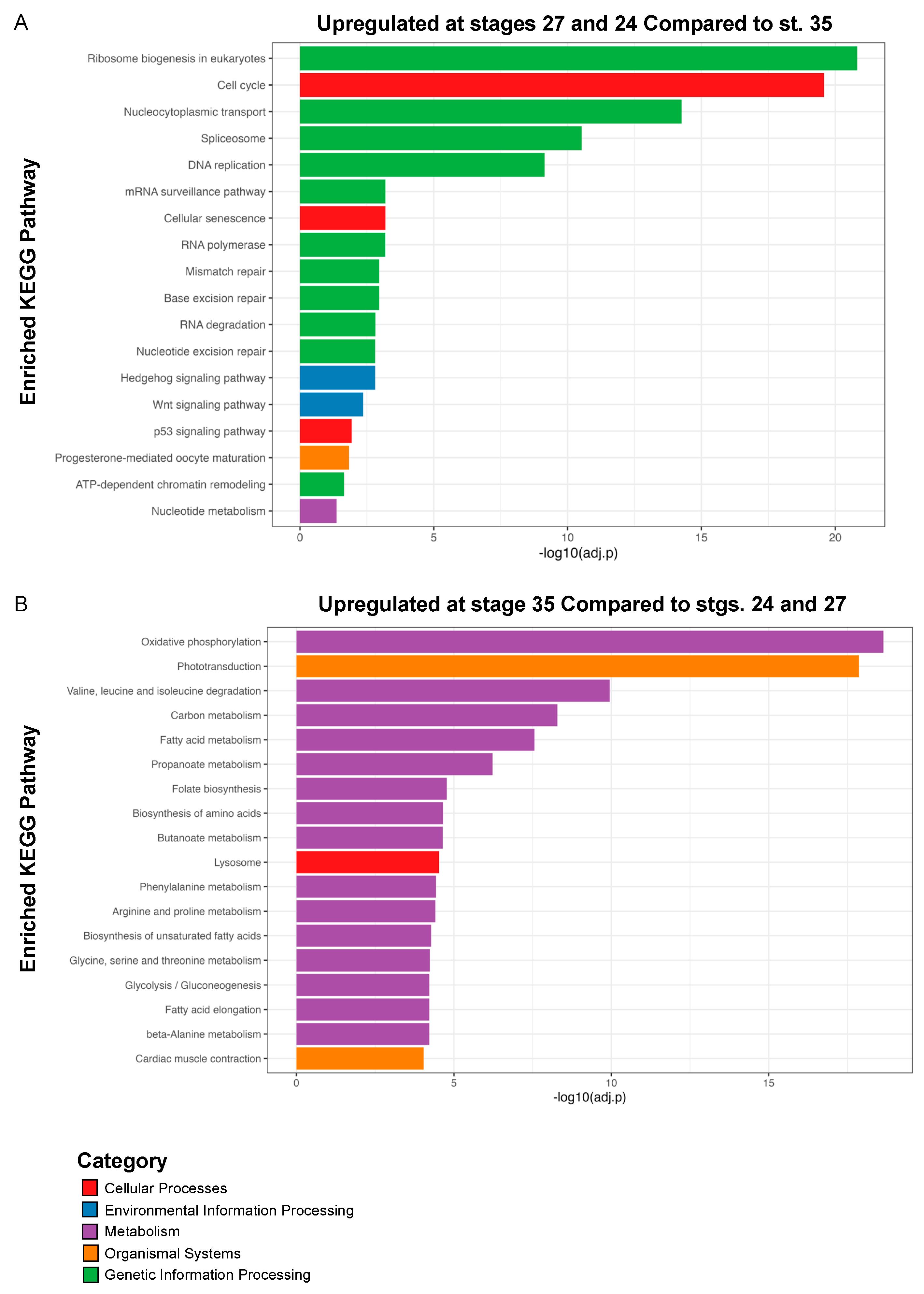 Figure 4. KEGG pathway enrichment analysis. Kyoto Encyclopedia of Genes and Genomes (KEGG) analysis of (A) statistically significantly upregulated genes at st. 24 and 27 compared to st. 35 and (B) statistically significantly upregulated genes at st. 35 compared to st. 24 and 27. Only top hits are shown in (B); for full list of KEGG pathways see Supplementary Figure S1.