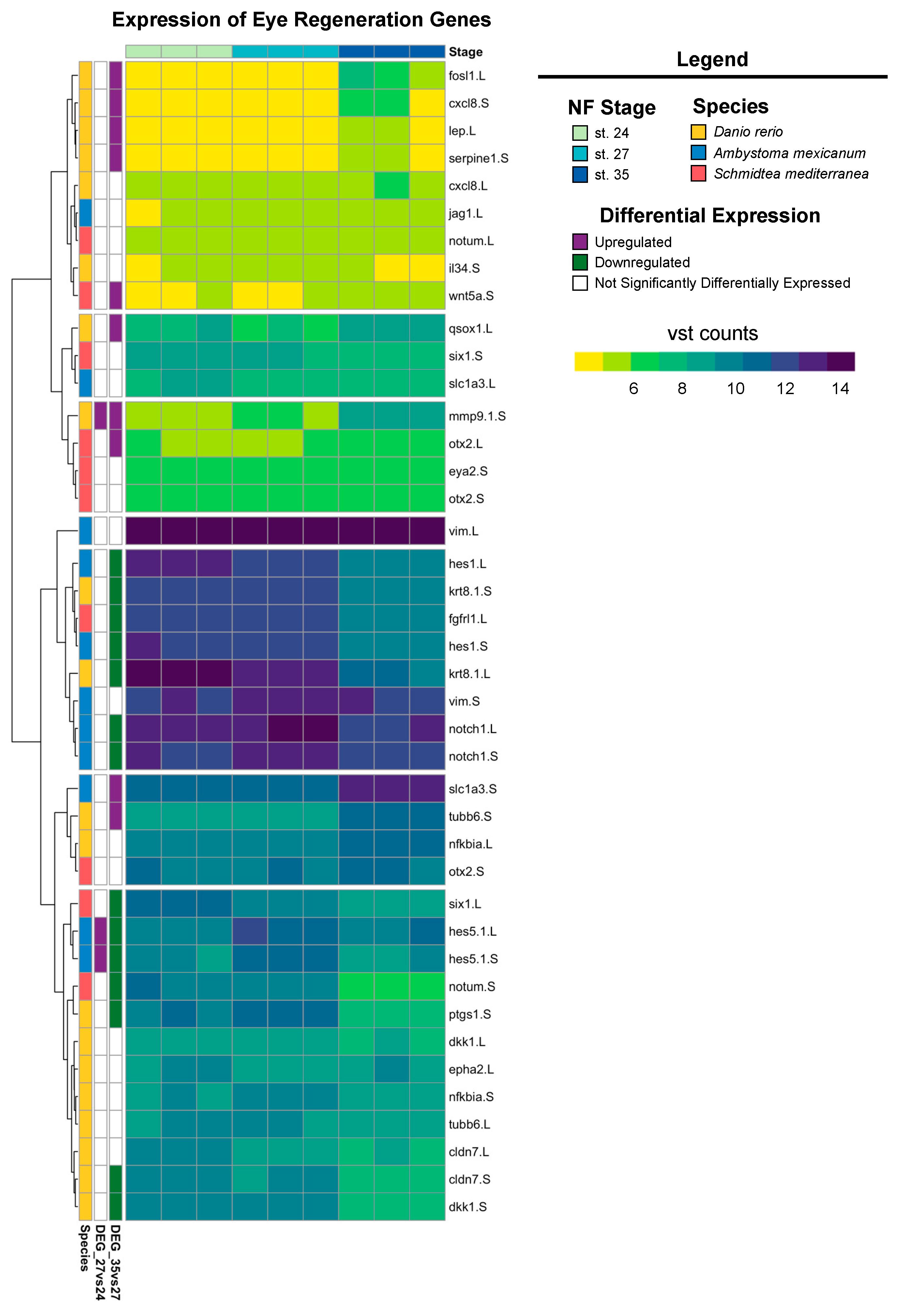 Figure 5. Expression of known eye regeneration genes. Expression (vst counts) of known eye regeneration genes in vertebrates (D. rerio and A. mexicanum) and the invertebrate S. mediterranea at st. 24, 27, and 35. Genes identified in the differential expression analysis (genes with FDR adj. p < 0.05 and absolute log2 fold change ≥ 1) between consecutive developmental stages are displayed to the left (purple: upregulated; green: downregulated; white: not differentially expressed).