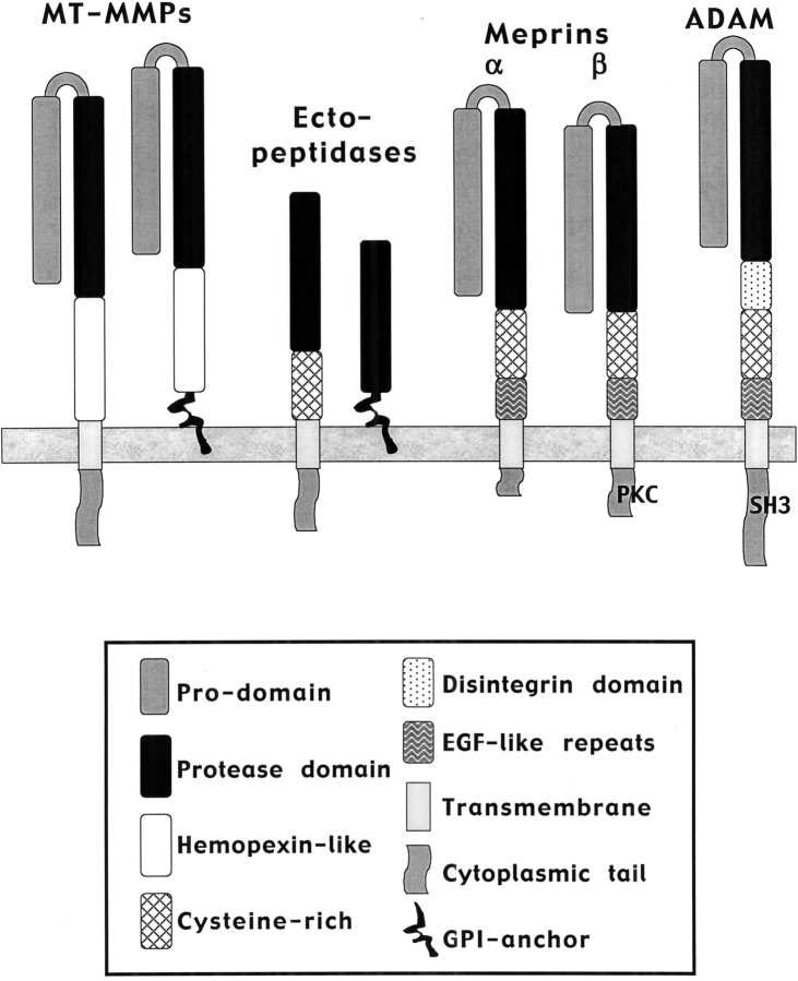 Figure 1. Schematic representation of cell surface proteases. Each is anchored in the membrane with a transmembrane domain or GPI linker. MT-MMPs and ectopeptidases come in both types, whereas meprins and ADAMs both possess transmembrane domains and cytoplasmic tails of varying sizes. Some ADAMs have SH3 ligand domains within their cytoplasmic tails. The cytoplasmic tails of meprin β subunits have a PKC phosphorylation site.