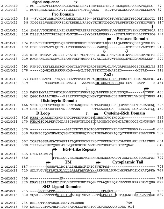 Figure 2. Sequence comparison of X-ADAM10 and X-ADAM13. Amino acid sequence alignments of full-length ADAM10 (GenBank/EMBL/DDBJ accession no. AF508151) and ADAM13 (accession no. U66003) with domain boundaries in black. The putative signal sequences are shown with an arrowhead. The cysteine-switch cysteine is indicated by a star (★) and all potential N-linked glycosylation sites in ADAM10 are denoted with an open arrow (⇓). The metalloprotease active site is underlined by a solid black line, the disintegrin loop is underlined by a broken line, and the transmembrane (TM) domain is underlined with a wavy line. All putative SH3 binding sites in the cytoplasmic tails of ADAMs 10 and 13 are boxed. Mutated amino acids in the zinc binding site (ADAM13 E341 to A; ADAM10 E385 to A) and the disintegrin loop (ADAM10 S529 to A and D530 to A; ADAM13 G474 to A, S475 to A, and D477 to A) are highlighted in bold.