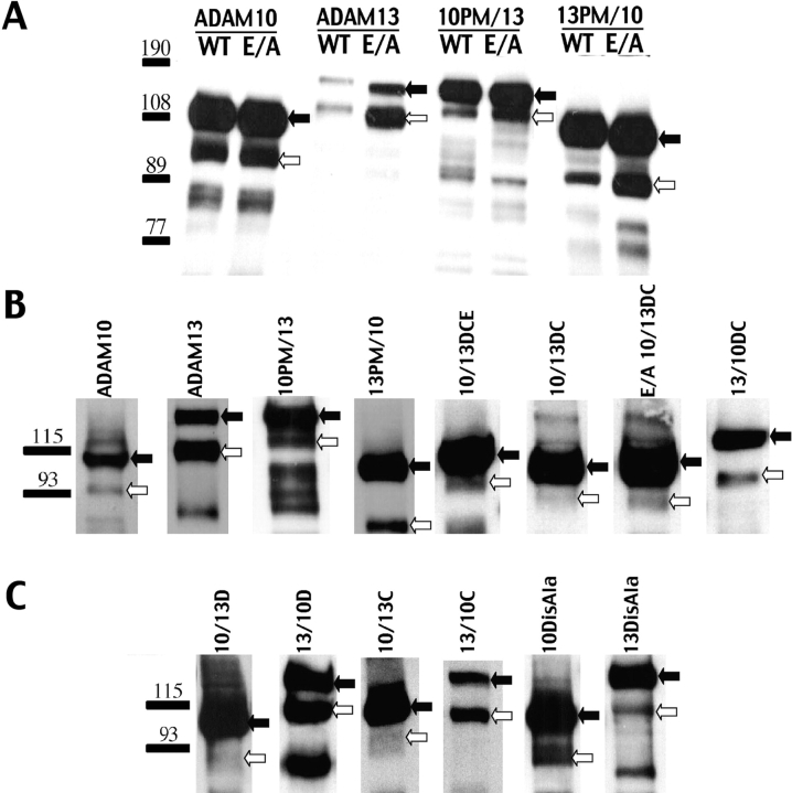 Figure 6. All ADAM constructs are proteolytically processed and found on the cell surface. (A) In whole embryo lysate Western blots with the anti–myc tag antibody, 9E10, both wild type and E/A mutants of ADAM10, ADAM13, and the Pro/Met chimeras are all found in unprocessed precursor forms with the pro-domain (black arrow) and in metalloprotease active forms, with the functionally repressive pro-domain removed (open arrows). (B and C) By affinity purification of cell surface biotin-labeled proteins and Western blotting with 9E10, the pro forms (black arrows) and metalloprotease forms (met forms, open arrows) of all ADAM constructs are seen. The pro and met forms generally run as expected based on calculated molecular weights with the addition of the myc tag.