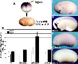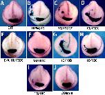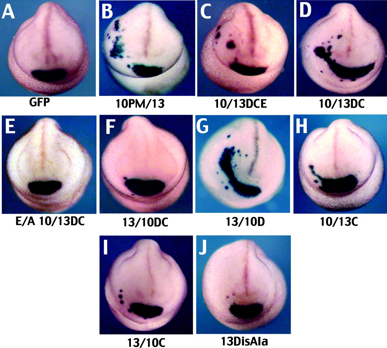 Figure 8. Anterior views of representative stage-22 Xenopus embryos showing XCG mRNA expression. (A) Embryos injected with GFP alone have no alterations in XCG expression. (B) Like ADAM13, the 10PM/13 chimeric construct causes a large expansion in XCG. The 10/13DCE (C) and 10/13DC (D) chimeras also perturb the cement gland. (E) An E/A point mutant in the catalytically active site of the 10/13DC chimera ablates its ability to cause hyperplasia of the cement gland. (F) Replacing ADAM13's disintegrin and cysteine-rich domains (chimera 13/10DC) did not fully ablate the XCG expansion, but it did lessen its severity. Replacing the disintegrin domain of ADAM13 with that of ADAM10 (chimera 13/10D) did not alter the function (G), whereas replacing only ADAM10's cysteine-rich domain with that of ADAM13 (10/13C) was sufficient to give that chimera the ability to cause alterations in XCG (H). Swapping ADAM13's cysteine-rich domain caused both a quantitative (6% severe phenotype vs. 33% for wild-type ADAM13; Fig. 7) and qualitative (I) decrease in activity. (J) Three point mutations in the disintegrin loop of ADAM13 diminish its ability to cause the enlargement of the cement gland, but do not affect its ability to cause its own degradation in vitro (unpublished data).