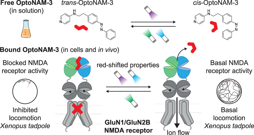 Introduction Neuronal plasticity, the brain’s ability to continually adapt to its environment or experiences, hinges on the dynamics of chemical synapses. At these specialized neuronal sites, neurotransmitters released from a presynaptic neuron cross the synaptic cleft and activate receptors on the postsynaptic neuron, hence mediating the transmission of information from one neuron to another. N-Methyl-d-aspartate receptors (NMDARs) are a class of ionotropic receptors activated by glutamate, the main excitatory neurotransmitter of the vertebrate central nervous system. They play a central role in synaptic transmission and plasticity, but their dysfunction is also involved in many pathologies. (1−3) NMDARs are tetramers composed of two GluN1 and two GluN2 (or GluN3) subunits. Each tetramer can either incorporate two identical GluN2 (or GluN3) subunits (diheteromers) or different GluN2 (or GluN3) subunits (triheteromers), each GluN2 subunit conferring to the receptor distinct biophysical and pharmacological properties, as well as different expression and signaling profiles. (1,2) Understanding the functional role of NMDAR individual subtypes in the brain is fundamental to developing new strategies to counteract the deleterious effects of NMDAR deregulation. Overactivation of NMDARs, as occurring during traumatic brain injury or stroke, induces an excessive increase in intracellular calcium, a process leading to neuronal death (excitotoxicity). (4) This excitotoxicity phenomenon is also observed in neurodegenerative diseases like Alzheimer’s and Parkinson’s diseases. (1,2,5,6) NMDAR overactivation furthermore occurs in other pathologies such as epilepsy, neuropathic pain, and depression. (1,2,5,7) Multiple studies point to a specific role of GluN2B-containing NMDARs (GluN2B-NMDARs) in triggering excitotoxicity, although this role is debated. (1,5,6) To counteract the deleterious effects of GluN2B-NMDAR overactivation, a large number of negative allosteric modulators (NAMs) specific for GluN2B-NMDARs were developed in the late 90s to early 2000s. (5,8−11) These antagonists, of which ifenprodil is the lead compound, (12,13) displayed neuroprotective properties in vitro and in vivo with reduced adverse effects compared to broad spectrum antagonists. (1,5,10,14−16) So far, however, all of these compounds failed in clinical trials because of a lack of effect or a narrow therapeutic window. (5,16,17) Ifenprodil derivatives bind at the level of the NMDAR N-terminal domains (NTDs), (18,19) which are bilobar domains preceding the agonist-binding domain (ABD) and constitute a hub for allosteric modulation in NMDARs (2,3,5,8) (see Figure 3A for the NMDAR subunit architecture). At this level, these compounds induce their inhibition by interacting with the upper lobe of GluN1 NTD and with the upper and lower lobes of GluN2B NTD, (18−20) which favors the entry of NMDARs into an inhibited state. (20−24) Some of these GluN2B-specific NAMs, such as ifenprodil, Ro25–6981, (25) or CP-101606, (26) are currently used as standard pharmacological tools to specifically target GluN2B-NMDARs in native tissues and have proven useful in investigating the contributions of this receptor subtype to several physiological and pathological processes. However, the use of these compounds in native tissues faces serious limitations due to their slow dissociation kinetics. In recombinant systems, time constants of dissociation of GluN2B-specific NAMs are in the tens of seconds to minute time range. (27,28) These slow kinetics are even more marked in native tissues. In brain slices, for instance, relief from inhibition by GluN2B-specific NAMs is so slow that it is considered irreversible. It is thus important to develop GluN2B-selective inhibitors with improved temporal resolution and reversibility of action for a dynamic control of GluN2B-NMDARs in native tissues. Photopharmacology, an approach based on the use of photosensitive ligands, allows such high temporal resolution of action. The most widely adopted method for optical modulation of ion channel activity involves caged compounds, whose activity is inhibited by a photolabile moiety (cage), but this strategy is limited by its irreversibility. (29,30) An alternative approach employs photoconvertible ligands that can alternate between an active and an inactive configuration after exposure to different light wavelengths. (29−31) This photoswitchable property is conferred to the molecule by the presence of a photoisomerisable unit such as an azobenzene, which can reversibly alternate between an extended trans and a twisted cis configuration using two different wavelengths, usually UV and blue–green light. (29−32) In a previous paper, we had developed a caged and a photoswitchable ifenprodil derivative. (33) However, while caged ifenprodil allowed fast GluN2B-NMDAR inhibition upon UV irradiation, the kinetics of NMDAR recovery from inhibition were still limited by the slow dissociation rate of ifenprodil. Additionally, the strategy we used to obtain a photoswitchable ifenprodil – addition of an azobenzene to the ifenprodil molecule (azo-extension approach) (34) – strongly decreased its inhibitory activity, probably because the ifenprodil binding site is too small to accommodate the supplementary azobenzene moiety. (33) In this paper, we took advantage of the chemical diversity of GluN2B-selective antagonists (5,9−11,19,35) and designed photoswitchable NAMs by incorporating the azobenzene moiety within the chemical scaffold of the molecule (azologization approach). (34,36−38) Among the four photoswitchable NAM candidates, OptoNAM-3 appeared as a potent and selective inhibitor of GluN2B-NMDARs in its trans configuration, while its cis isomer was inactive. OptoNAM-3 allowed real-time and reversible control of GluN2B-NMDAR activity with fast (in the second range) temporal resolution. Surprisingly, binding of OptoNAM-3 to GluN2B-NMDARs induced a red-s