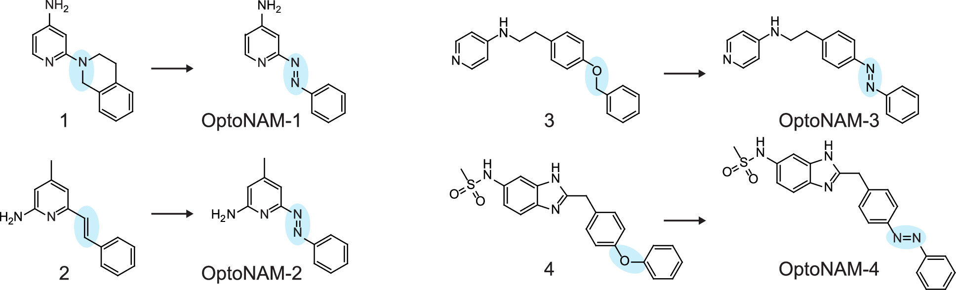 Figure 1. Design of photoswichable NAMs for GluN1/GluN2B receptors. Chemical structures of published GluN2B-selective NAMs (parent compounds 1–4) and their photoswitchable equivalents (OptoNAM-1 to OptoNAM-4) designed by substituting an “azostere” moiety of the parent compound (blue circle) by an azo moiety. Compounds 1, 2, 3, and 4 correspond to compounds 9n, (39) 14, (40) 11, (41) and 17a, (42) respectively. |