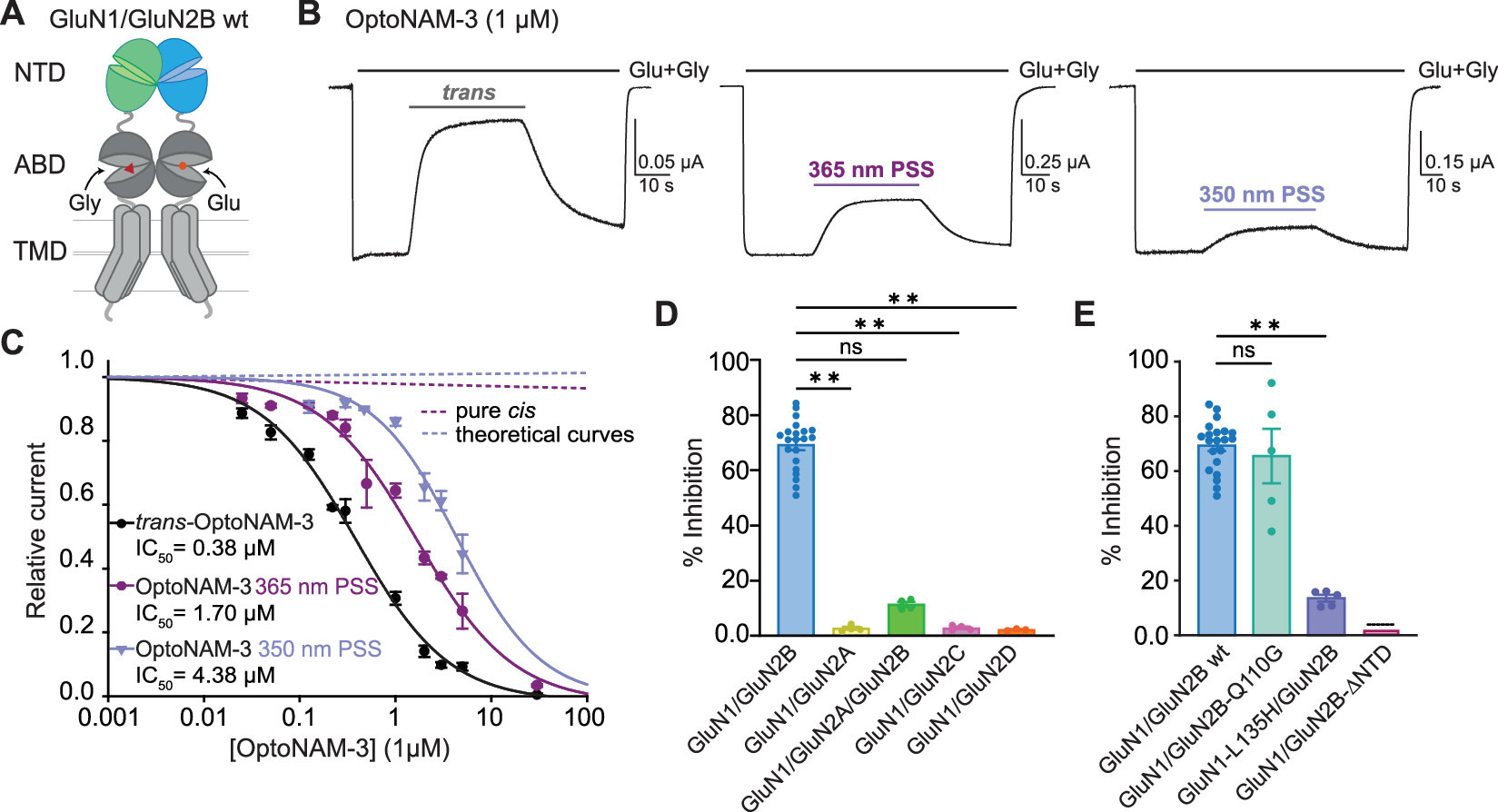 Figure 3. OptoNAM-3 inhibits GluN1/GluN2B selectively and in a photodependent manner. (A) Architecture of a dimer of GluN1 and GluN2B subunits with N-terminal domains (NTDs) in green and blue, respectively. ABD, agonist-binding domain; TMD, transmembrane domain. (B) Representative current traces from oocytes expressing GluN1/GluN2B receptors following application of agonists glutamate and glycine (Glu + Gly, 100 μM each) and 1 μM OptoNAM-3 either in the dark (left), or preilluminated at 365 nm (middle) or 350 nm (right). (C) Dose–response curves of OptoNAM-3 activity on GluN1/GluN2B receptors in the dark (black curve, IC50 = 0.38 ± 0.03 μM, n = 4–21) or preilluminated with 365 nm (violet curve, IC50 = 1.7 ± 0.2 μM, n = 4–17) or 350 nm (lavender curve, IC50 = 4.4 ± 0.6 μM, n = 3–13). Theoretical curves of pure cis-OptoNAM-3 were calculated either from the 365 nm PSS (18% trans/82% cis, violet dotted line) or from the 350 nm PSS (9% trans/91% cis, lavender dotted line). (D) Inhibitions by 1 μM trans-OptoNAM-3 of GluN1/GluN2B, GluN1/GluN2A, GluN1/GluN2C, and GluN1/GluN2D diheteromers, as well as GluN1/GluN2A/GluN2B triheteromers (inhibition: 69% ± 2%, n = 21 for GluN1/GluN2B; 2.7% ± 0.5%, n = 4 for GluN1/GluN2A; 11.4% ± 0.9%, n = 4 for GluN1/GluN2A/GluN2B; 3.2% ± 0.5%, n = 4 for GluN1/GluN2C; and 2.2% ± 0.2%, n = 3 for GluN1/GluN2D). (E) Percentage of inhibition by 1 μM trans-OptoNAM-3 in the dark of wt GluN1/GluN2B receptors (in blue) or of receptors mutated at key residues involved in EVT-101 binding only (GluN1/GluN2B-Q110G, in aquamarine), in ifenprodil binding only (GluN1-L135H/GluN2B, in violet), or on a mutant disrupting binding at both EVT-101 and ifenprodil binding sites (GluN1/GluN2B-ΔNTD, in pink; dotted lines above the bar mean that inhibition was calculated from the dose–response curve in Figure S3E). n.s., p > 0.05; **, p < 0.01; Kruskal–Wallis’ test followed by Dunn’s multiple comparison test. |