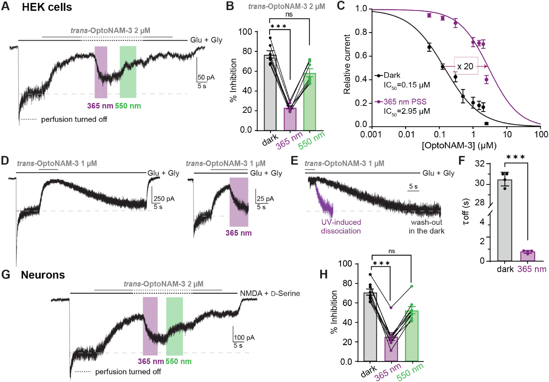 Figure 4. Fast and reversible photomodulation of GluN1/GluN2B receptors in mammalian cells. (A) Current trace from a HEK cell expressing GluN1/GluN2B receptors following application of glutamate and glycine (Glu + Gly, 100 μM each) and 2 μM OptoNAM-3 in the dark (mostly in trans). Once steady-state inhibition by trans-OptoNAM-3 was reached, perfusion was stopped (dashed lines), and the patched cell and the surrounding extracellular medium were illuminated by 365 nm (violet bar) and then 550 nm light (green bar). (B) OptoNAM-3 inhibition depending on the light conditions. 2 μM OptoNAM-3 inhibits GluN1/GluN2B currents by 77% ± 4% in the dark and by 23% ± 2% under UV light and can be restored to 59% ± 4% by 550 nm light. n = 7; n.s., p > 0.05; ***, p < 0.001; Friedman’s (repeated measures) test followed by Dunn’s multiple comparison test. (C) Dose–response curves of OptoNAM-3 on GluN1/GluN2B expressed in HEK cells in the dark (black curve, IC50 = 0.15 ± 0.03 μM, n = 4–8) and when the cell is illuminated at 365 nm (violet curve, IC50 = 3.0 ± 0.9 μM, n = 4–7). (D) Current traces showing the relief of trans-OptoNAM-3 inhibition by OptoNAM-3 washout in the dark (left) or by UV light illumination (right). (E) Superposition of the inhibition relief traces in the dark (black) and under UV light (violet) showing much faster relief of inhibition by UV illumination than washout of trans-OptoNAM-3. (F) Summary of the kinetics of inhibition relief in the dark and UV conditions (τoff = 30.5 ± 0.5 s, n = 4 in the dark and τoff = 0.82 ± 0.06 s, n = 4 under UV illumination). ***, p < 0.001; Mann–Whitney’s test. (G) Current trace from a DIV 8 cultured cortical neuron following application of NMDA (300 μM) and d-serine (50 μM), and 2 μM OptoNAM-3 in the dark (in trans). Same protocol as in Figure 4A. (H) OptoNAM-3 inhibition depending on the light conditions. 2 μM OptoNAM-3 inhibits NMDA currents by 70% ± 3% in the dark and by 25% ± 4% under UV light and can be restored to 52% ± 3% by applying 550 nm light. n = 9, n.s., p > 0.05, ***, p < 0.001; Friedman’s test followed by Dunn’s multiple comparison test. |