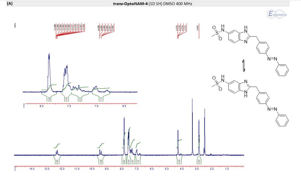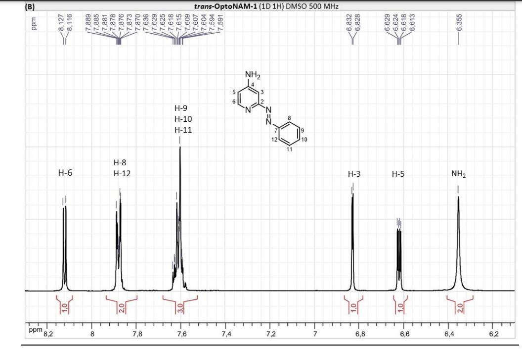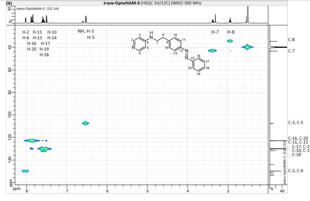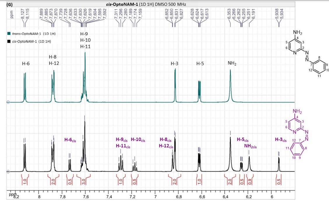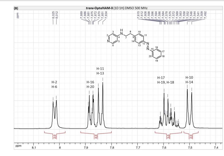 Figure S6. OptoNAM-3 photochemical properties in different solvents. (A) UV-visible absorption spectra of OptoNAM-3 (25 µM) in physiological aqueous solution (Ringer at pH 7.3), DMSO and toluene. Black curves represent the dark PSS, the violet ones OptoNAM-3 365 nm PSS, the blue and green curves represent OptoNAM-3 460 nm and 550 nm PSS obtained after illumination of the dark PSS, and the dotted blue and green curves represent OptoNAM-3 460 nm and 550 nm PSS obtained after illumination of the 365 nm PSS. (B) Maximum absorption wavelengths of the peaks corresponding to the π → π* transition (in regular police) and n → π* transition (in italic) for the different OptoNAM-3 PSS in the different solvents. For each solvent, the absorbance of each peak relative to the absorbance of the π → π* transition peak of the dark PSS is indicated in parenthesis. |