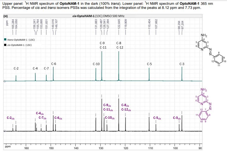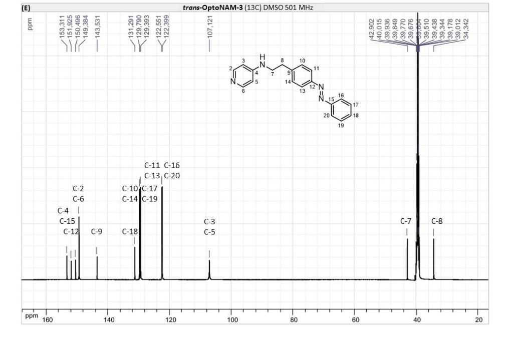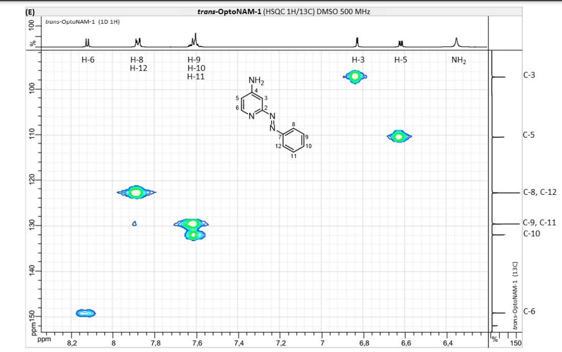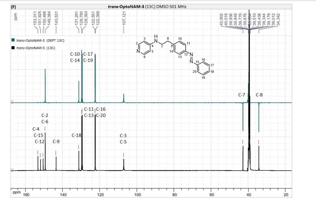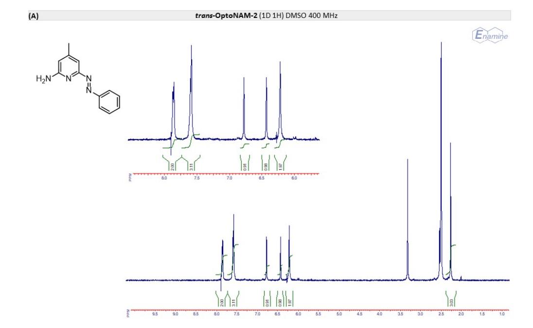 Figure S6. OptoNAM-3 photochemical properties in different solvents. (A) UV-visible absorption spectra of OptoNAM-3 (25 µM) in physiological aqueous solution (Ringer at pH 7.3), DMSO and toluene. Black curves represent the dark PSS, the violet ones OptoNAM-3 365 nm PSS, the blue and green curves represent OptoNAM-3 460 nm and 550 nm PSS obtained after illumination of the dark PSS, and the dotted blue and green curves represent OptoNAM-3 460 nm and 550 nm PSS obtained after illumination of the 365 nm PSS. (B) Maximum absorption wavelengths of the peaks corresponding to the π → π* transition (in regular police) and n → π* transition (in italic) for the different OptoNAM-3 PSS in the different solvents. For each solvent, the absorbance of each peak relative to the absorbance of the π → π* transition peak of the dark PSS is indicated in parenthesis. |