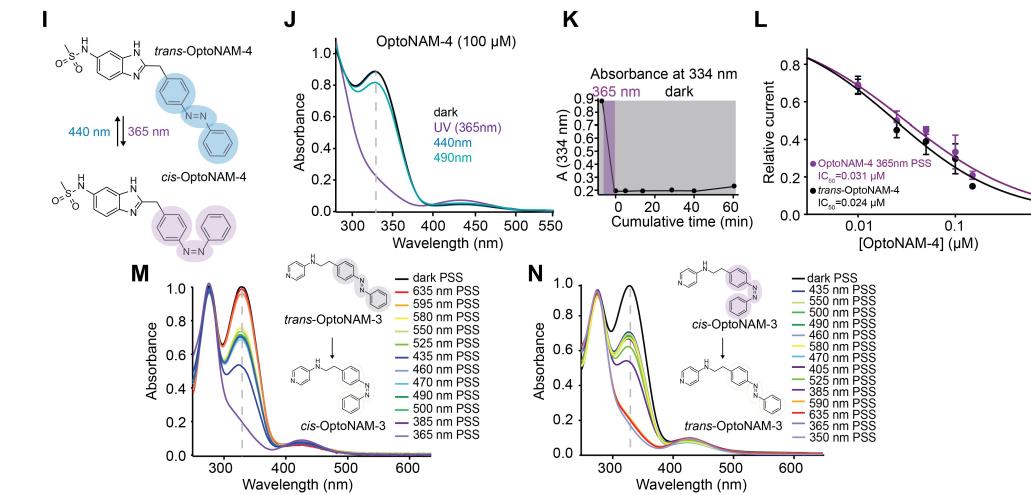 Figure S1. Photochemical properties of OptoNAM-1 to -4 and their photodependent activity at GluN1/GluN2B receptors. (A-D) OptoNAM-1. (A) In solution, OptoNAM-1 can be switched from trans to cis configuration by UV illumination (365 nm) and back to trans by 440 nm light. (B) UV-visible absorption spectra of OptoNAM-1 in physiological aqueous buffer (Ringer pH 7.3, see Methods) in the dark (black curve), after 365 nm illumination (violet curve) and subsequent illumination of the 365 nm PSS by 440 or 490 nm light. Dashed line represents the wavelength of peak absorption of trans-OptoNAM-1 (320 nm). (C) OptoNAM-1 365 nm PSS (mostly cis) displays strong thermal stability in the dark in Ringer pH 7.3, at room temperature: no change of the absorption spectra was observed up to 60 min after 365 nm illumination. (D) Dose-response curves of OptoNAM-1 activity on GluN1/GluN2B receptors in the dark (black curve, IC50 = 11 ± 1 µM, n = 4-6) or pre-illuminated with 365 nm (violet curve, IC50 = 37 ± 2 µM, n = 5-17). (E-H) OptoNAM-2. (E) In solution, OptoNAM-2 can be switched from trans to cis by UV illumination (365 nm) and back to trans by 490 nm light. (F) UV-visible absorption spectra of OptoNAM-2 in physiological aqueous buffer (Ringer pH 7.3, see Methods) in the dark (black curve), after 365 nm illumination (violet curve) and subsequent illumination of the 365 nm PSS by 440 or 490 nm light. Dashed line represents the wavelength of peak absorption of trans-OptoNAM-2 (371 nm). (G) OptoNAM-2 365 nm PSS (mostly cis) displays strong thermal stability in the dark in Ringer pH 7.3, at room temperature: no change of the absorption spectra was observed up to 60 min after 365 nm illumination. (H) Dose-response curves of OptoNAM-2 activity on GluN1/GluN2B receptors in the dark (black curve, IC50 = 24 ± 2 µM, n = 3-5) or pre-illuminated with 365 nm (violet curve, IC50 = 117 ± 10 µM, n = 3-8). (I-L) OptoNAM-4. (I) In solution, OptoNAM-4 can be switched from trans to cis by UV illumination (365 nm) and back to trans by 440 nm light. (J) UV-visible absorption spectra of OptoNAM-4 in aqueous buffer (Ringer pH 7.3, see Methods) in the dark (black curve), after 365 nm illumination (violet curve) and subsequent illumination of the 365 nm PSS by 440 or 490 nm light. Note that 440 nm allows full return to the dark state. Dashed line represents the wavelength of peak absorption of trans-OptoNAM-2 (334 nm). (K) OptoNAM-4 365 nm PSS (mostly cis) displays strong thermal stability in the dark in Ringer pH 7.3, at room temperature: only little change of the absorption spectra was observed up to 60 min after 365 nm illumination. (L) Dose-response curves of OptoNAM-4 activity on GluN1/GluN2B receptors in the dark (black curve, IC50 = 24 ± 26 nM, n = 3) or pre-illuminated with 365 nm (violet curve, IC50 = 31 ± 29 nM, n = 3). (M,N) OptoNAM-3 trans-to-cis and cis-to-trans isomerization for different illumination wavelengths. (M) OptoNAM-3 UV-visible absorption spectra in physiological aqueous buffer (Ringer pH 7.3) in the dark (black curve) and PSS obtained after illumination with wavelengths ranging from 350 to 635 nm of the dark PSS. These spectra were used to create panel D and E from Figure 4. (N) OptoNAM-3 UV-visible absorption spectra in the dark (black curve), after 365 nm illumination (violet curve), and PSS obtained after illumination with wavelengths ranging from 350 to 635 nm of the 365 nm PSS. These spectra were used to create panels I and J from Figure 5. |