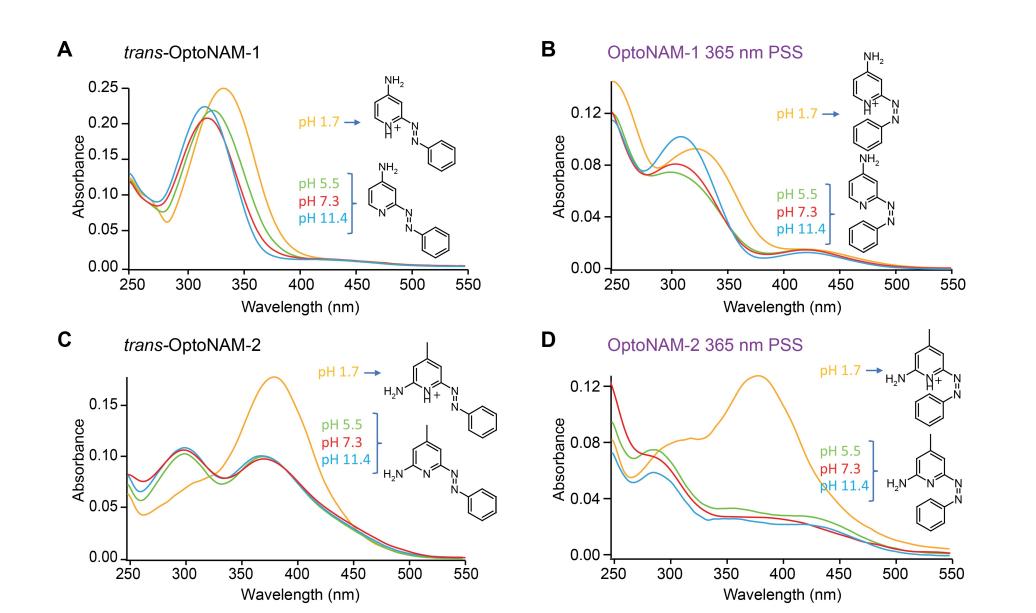 Figure S2. Decreased pKa of OptoNAM-1 and -2 compared to their parent compounds are likely responsible for their decreased activity. (A-F) pKa estimation of the trans (A,C,E) and cis (365 nm PSS) (B,D,F) isomers of OptoNAM-1 (A,B), OptoNAM-2 (C,D) and OptoNAM-3 (E,F) by UV-visible spectrum analysis. UV-visible absorption spectra were measured at different pH (1.7 in yellow, 5.5 in green, 7.3 in red and 11.4 in blue). Correspondence between spectra at different pH and OptoNAM protonated and unprotonated chemical structures is indicated. A leftward shift and a decrease of the absorbance peak corresponding to the aminopyridine carrying the charge was observed upon OptoNAM deprotonation. This effect is most obvious for OptoNAM-2 and characteristic of the deprotonated spectra of 2,6-diaminopyridine bases.9 Based on this analysis, at physiological pH, OptoNAM-1 and -2, either in cis or trans, are unprotonated, while OptoNAM-3 is protonated. (G) Relationship between the activity and the measured pKa of compounds from the same chemical series as parent compound 1 (values from ref. 3) (black dots). Parent compound 1 is highlighted as a thick green dot. Parent compound 2 (orange), as well as trans-OptoNAM-1 (red) and -2 (grey) were added to the plot according to their published or measured activity (Supplementary Table 1), and predicted pKa (pKa was predicted by Marvin, Chemaxon https://www.chemaxon.com). “Neutral” (dark green) and “Positive” (light green) indicate whether the compounds of a given pKa are neutral (dark green) or positively charged (light green) at physiological pH (pH = 7.3). Note the tight correlation between pKa and activity, suggesting that the decreased pKa of OptoNAM-1 and -2 induced by azologization of the parent compounds, resulting in a loss of protonation at physiological pH, is responsible for the large decrease of activity of these compounds. |
