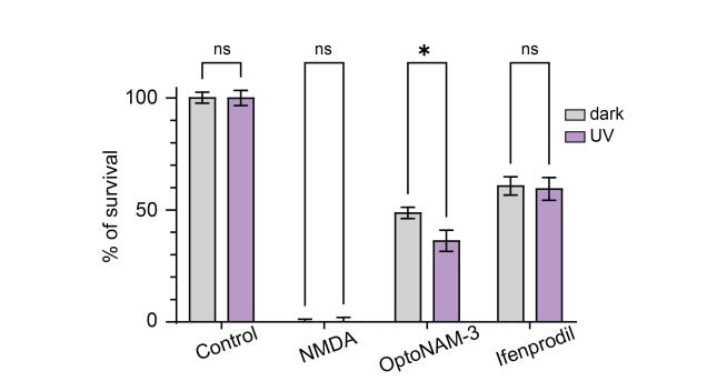 Figure S4. OptoNAM-3 decreases NMDA-induced neuronal death in a photodependent manner. Percentage of neuronal survival in cultured cortical neurons exposed either to control (0.01% DMSO and 10 µM Glycine), NMDA (100 µM NMDA + 10 µM Glycine), NMDA + ifenprodil or NMDA + OptoNAM-3 (100 µM NMDA + 10 μM Glycine + 5 µM of inhibitor), in the dark (grey bar) or after 2 min UV (365 nm) illumination (violet bar). In the presence of trans-OptoNAM-3 (dark) or ifenprodil, cell survival increased to 50% and 60%, respectively. When 365 nm illumination followed the addition of OptoNAM-3, cell survival was decreased to 35% but the extent of survival induced by ifenprodil was not affected, precluding any deleterious effect of the UV light treatment on cell survival. Multiple comparisons were performed by two-way ANOVA with Bonferroni’s correction; n.s., p > 0.05; *, p < 0.05; n = 5-8 batches of cultures per condition, in each culture 4-6 wells/condition. Data presented here (mean and SEM) were normalized to the control and NMDA conditions (see Methods for the calculation protocol). |