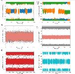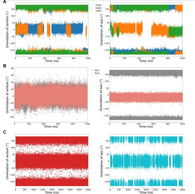 Figure S7. Evolution of trans-OptoNAM-3 conformation in its binding site and in water. (A) Evolution of the two angles that describe bound trans-OptoNAM-3 conformations during 3 trajectories of a MD simulation without constraints. The three colors represent the three trajectories. Left: orientation of the aniline. Right: orientation of the phenyl-azo moiety (C-C-N=N angle) (Figure 7A). For the orientation of aniline, in trajectories 01 and 02 we observed exchanges between 0 and 180°, whereas in trajectory 03 the angle stayed at 180°. On average, this angle is 60.8% at 180°, which means that this conformation is more stable by roughly 0.3 kcal/mol than the one at 0°. For the orientation of the azo moiety, in trajectory 01 the angle stayed at 180° and switched to 0° after 993 ns; for trajectory 02, we observed six conversions between the two basins; for trajectory 03, we observed some exchanges at the beginning, a stability from 125 to 810 ns, and then a final exchange. On average, this angle is 67.9% at 180°, which means that this conformation is more stable by roughly 0.4 kcal/mol than the one at 0°. At the end of this simulation without constraints, we observed that the distance between the GluN1 and GluN2B lower lobes had increased, far from the distance measured in the inhibited, full-length receptor (see Text S2). We therefore decided to perform new simulations where the protein heavy atoms were restrained close to their crystallographic positions (see Text S2 and Methods) (B) Evolution of the same angles but for the Rot-1 (grey) and Rot-2 (salmon) rotamers of OptoNAM-3 during the simulations under constraint. Left: orientation of the aniline. Right: orientation of the phenyl-azo moiety (C-C-N=N angle). (C) Evolution of the two angles for free transOptoNAM-3 in water. For the orientation of aniline, the two basins at 0° and 180° are populated respectively 48.2% and 51.8% of the time, whereas for the orientation of the phenyl-azo they are populated at respectively 53.5% and 46.5% of the time. This corresponds to differences of free energies below 0.1 kcal/mol. We observed very low differences of free energies between the conformations of trans-OptoNAM-3 both in the protein and in water solution; however, in solution, we observed much more transitions between each conformation, which means that the free energy barrier to go from one conformation to the other is much smaller in solution than when bound to the protein. |