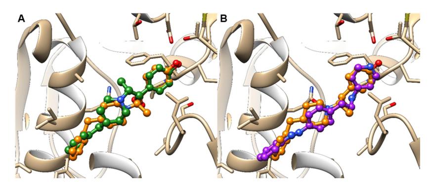 Figure S9. (A) Overlap between crystallographic (in orange) and docked (in green) poses of ifenprodil. (B) Overlap between the crystallographic pose of ifenprodil (in orange) and the docked pose of trans-OptoNAM3 (in purple). |