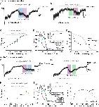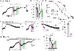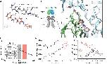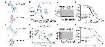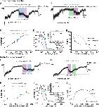 Figure S3. Additional data relative to Figure 3. (A) Inhibition by OptoNAM-3 365 nm PSS is exclusively mediated by the remaining trans isomer still present in solution. (A) Dose-response curves of OptoNAM-3 activity on GluN1/GluN2B in the dark (black curve, IC50 = 0.38 ± 0.03 µM, n = 4-21), pre-illuminated by 365 nm (purple curve, IC50 = 1.7 ± 0.2 µM, n = 4- 17) and theoretical dose-response curve (blue) of a mixture of 18% trans- and 82% cis-OptoNAM-3 (corresponding to the 365 nm PSS determined by HPLC) assuming that only the trans isomer is active. The theoretical curve was calculated from the trans dose-response curve in the dark. The 18% trans theoretical dose-response curve superimposes well to the one of OptoNAM-3 365 nm PSS. (B) Dose-response curves of OptoNAM-3 activity on GluN1/GluN2B in the dark (black curve, IC50 = 0.38 ± 0.03 µM, n = 4-21), preilluminated by 350 nm (lavender curve, IC50 = 4.4 ± 0.6 µM n = 3-13) and theoretical dose-response curve (pink) of a mixture of 9% trans- and 91% cis-OptoNAM-3 (corresponding to the 350 nm PSS determined by HPLC) assuming only the trans isomer is active. The 9% trans theoretical dose response curve is also well superposed to the one of OptoNAM-3 350 nm PSS. This shows that the activity of the 365 nm PSS and 350 nm PSS of OptoNAM-3 can entirely be explained by the amount of remaining trans isomer in the PSS. (C,D) Among iGluRs, OptoNAM-3 is selective for NMDARs. Inhibition by 10 μM trans-OptoNAM-3 (dark PSS, C) and OptoNAM-3 365 nm PSS (D) of agonist-induced currents (glutamate and glycine, 100 μM each) carried by GluN1/GluN2B NMDARs, GluA1 and GluA2 AMPA receptors, and GluK2 kainate receptors. Oocytes expressing GluK2 receptors were treated with concanavalin A (2 mM) before recording to decrease receptor desensitization. (C) Trans-OptoNAM-3 inhibitions: 94 ± 1%, n = 5 for GluN1/GluN2B; -7.4 ± 2.7%, n = 3 for GluA1; -7.4 ± 3.5%, n = 6 for GluA2, 3.1 ± 3.4%, n = 5 for GluK2. (D) Cis-OptoNAM-3 inhibitions: 68 ± 6%, n = 5 for GluN1/GluN2B, -6.0 ± 2.3%, n = 3 for GluA1, -4.9 ± 1.5%, n = 6 for GluA2, -1.5 ± 2.1%, n = 5 for GluK2. (E,F) OptoNAM-3 binds at the ifenprodil binding site. (E) Dose-response curves of OptoNAM-3 on GluN1/GluN2B-∆NTD receptors in the dark (black curve, IC50 = 20 ± 4 µM, n = 3-5) or pre-illuminated with 365 nm (violet curve, IC50 = 25 ± 6 µM, n = 3-5). OptoNAM-3 dose-response curves on wild type GluN1/GluN2B receptors are shown as dashed curves (black and violet for the dark and 365 nm PSS conditions, respectively). The remaining, low affinity inhibition of OptoNAM-3 on GluN1/GluN2B-∆NTD receptors is likely due to a non-selective pore block of NMDARs at negative holding potentials, as previously shown for ifenprodil.10,11 (F) Dose-response curves of trans-OptoNAM-3 in the dark in absence (black curve, IC50 = 0.46 ± 0.06 µM, n = 4) and in presence of 0.2 µM ifenprodil (a concentration close to ifenprodil IC50, orange curve). Ifenprodil increases OptoNAM-3 IC50 by ~2-fold (IC50 = 1.0 ± 0.1 µM, n = 5 in presence of 0.2 µM ifenprodil), which is consistent with a competitive interaction between these two compounds. |