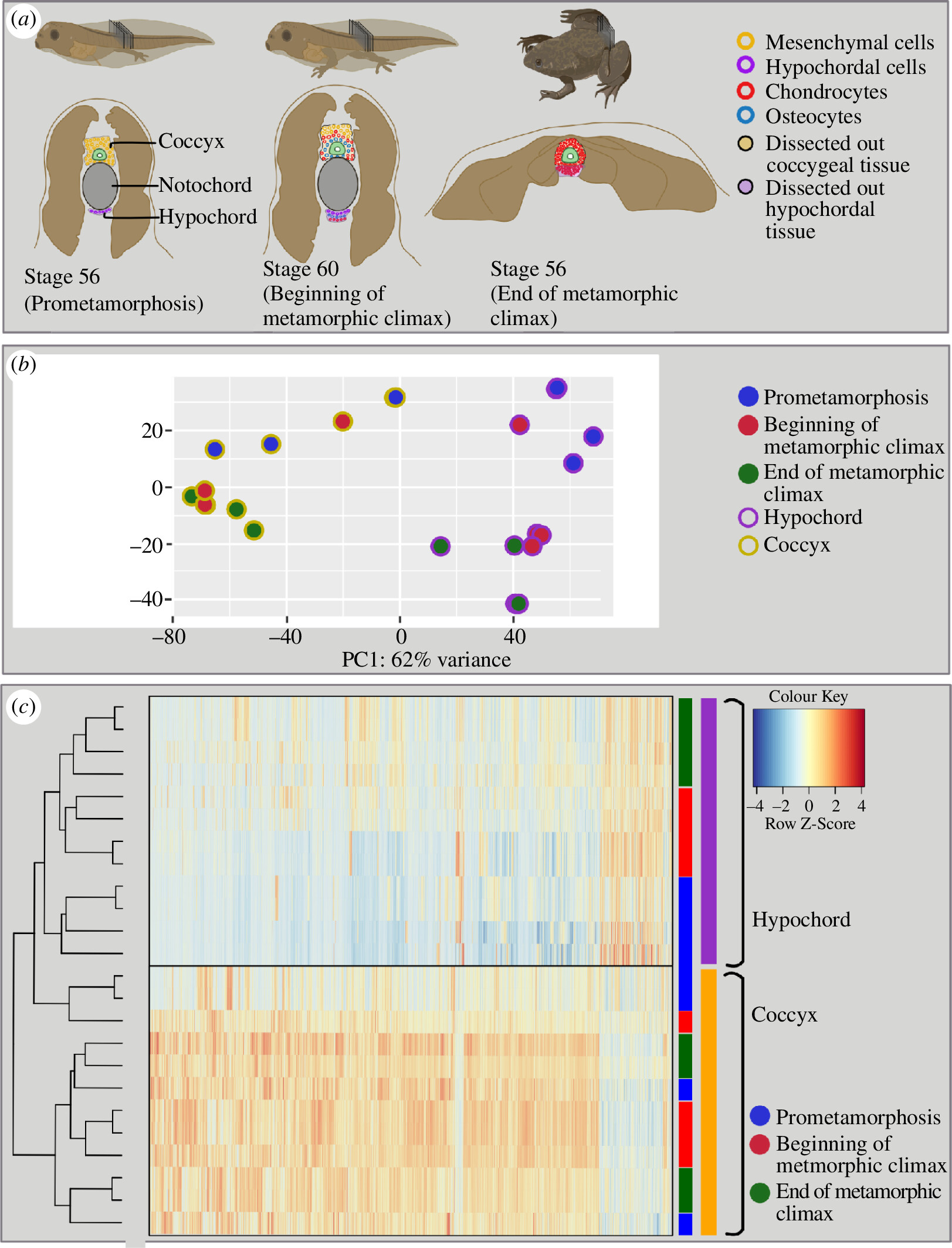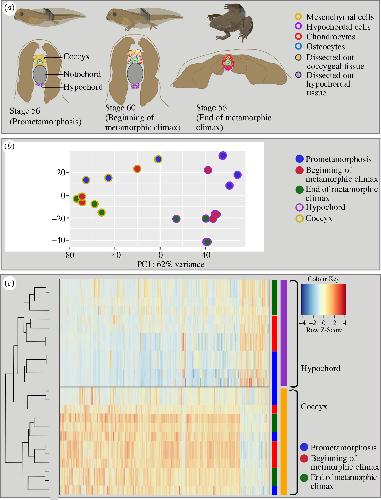 Figure 1. Changes in transcriptomics during anuran urostyle development. (a) The experimental setup and the developmental stages used for laser-capture microdissections. Ten sections of cryosections (10 μM each) were taken from three developmental stages (stage 56: prometamorphosis; stage 61: beginning of the metamorphic climax and stage 65: end of metamorphosis), and the coccygeal and hypochordal tissues were dissected out. (b) Principal component analysis for the urostyle tissues (coccyx and hypochord) used for the transcriptomic assay (n = 4 biological replicates per developmental stage). Each dot represents a tissue sample. (c) Heatmap, highlighting the differentially expressed genes, compared between three developmental stages and two tissue types. The heatmap highlights that the two tissue types possess two distinct sets of genes.
