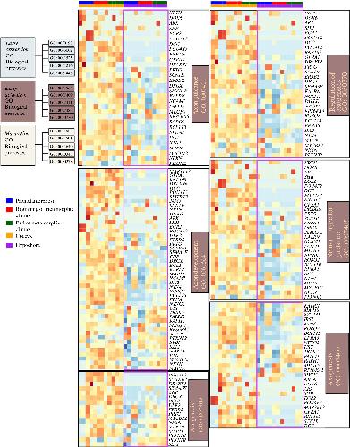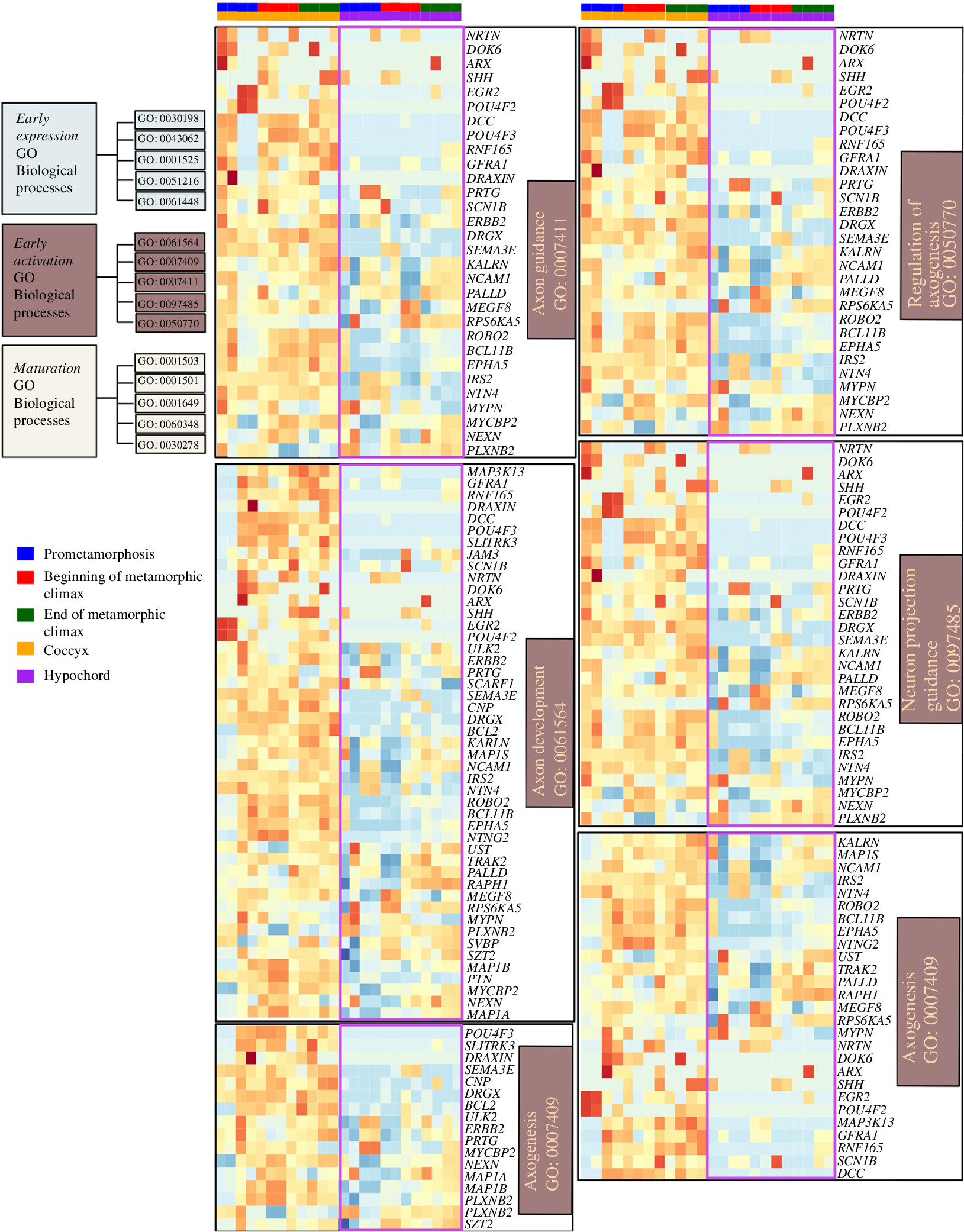 Figure 4. Heatmaps showing differentially expressed genes involved in GO functions belonging to the ‘early activation cluster’ of osteocyte differentiation. This cluster includes the GO functions ‘axon guidance’, ‘axon development’, ‘axogenesis’, ‘regulation of axogenesis’ and ‘neuron projection guidance’. Genes of interest that are differentially expressed between the coccyx and hypochord are highlighted in purple.