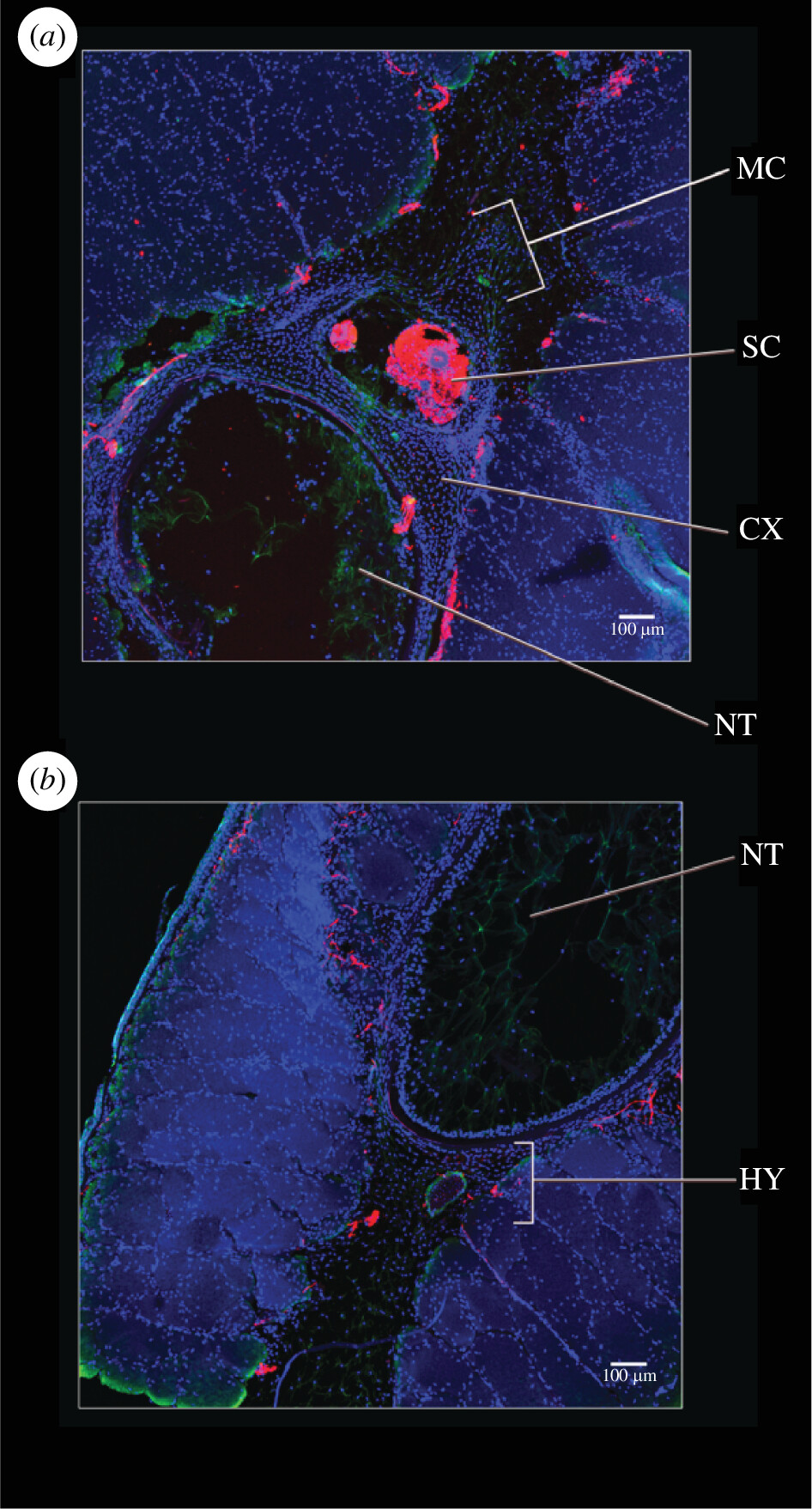 Figure 2. Comparison of the hypochordal and coccygeal sections before metamorphosis (stage 57). (a) A transverse section across the coccyx, highlighting the aggregating mesenchymal cells around the spinal cord. (b) A transverse section across the hypochord, highlighting the embryonic hypochordal cells ventral to the notochord and notochordal sheath. Nuclei stained in blue, using DAPI and neurons stained in red using acetylated tubulin. Abbreviations: CX, coccyx; HY, hypochord; MC, mesenchymal cells; NT, notochord; SC, spinal cord.