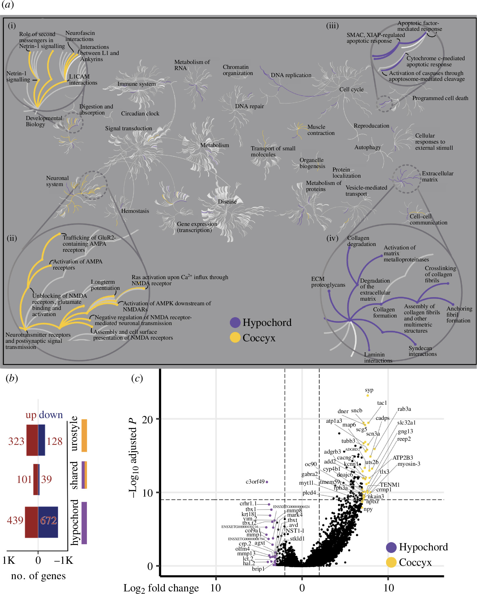 Figure 3. Comparative transcriptomic analysis of the two tissue types: coccyx and hypochord. (a) A reactome pathway analysis for up/down regulatory genes in coccyx versus hypochord; the central circles represent a top-level pathway, and the circles away from the centre represents lower levels in each respective pathway. ‘Zoomed-in’ sections show top-level pathways of (i) developmental biology, (ii) neuronal system, (iii) programmed cell death and (iv) extracellular matrix organization. Overrepresented pathways (p < 0.05) are coloured in yellow (coccyx) and purple (hypochord). Pathways that are not significant are shown in light grey lines. Most hypochordal genes are involved in organizing the extracellular matrix, whereas the majority of coccygeal genes are involved in neuronal remodelling and modifications. (b) The total number of urostyle-responsive genes (FDR < 0.01) is between hypochord and coccyx. (c) Volcano plot showing differentially expressed genes across hypochord and coccyx during development (p < 0.05, FDR < 0.01).