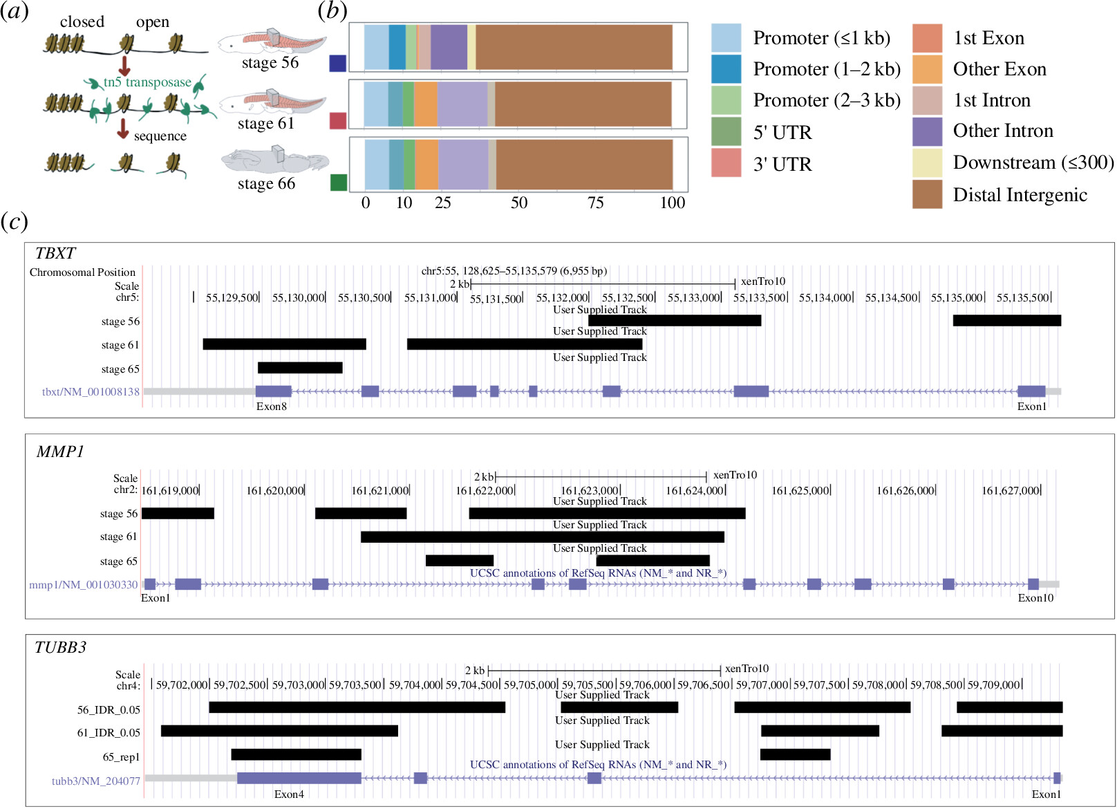 Figure 5. Urostyle-responsive regulatory regions. (a) Schematic diagram showing the workflow for chromatin profiling experiment. (b) Proportions of developing urostyle ATAC-seq peaks annotated to different genomic regions across development; majority of the peaks fall within the distal intergenic region and beginning (stage 61) and end of metamorphic climatic (stage 65) peaks differ from the prometamorphic (stage 56) ATAC-seq peaks with respect to peaks falling within the exon regions that are not the first exon. (c) Open chromatin regions (depicted using black rectangles) identified from IDR 0.05 called peaks for stage 56, stage 61 and stage 65 at the loci of validated upregulatory genes narrowed down from RNA-seq analyses.