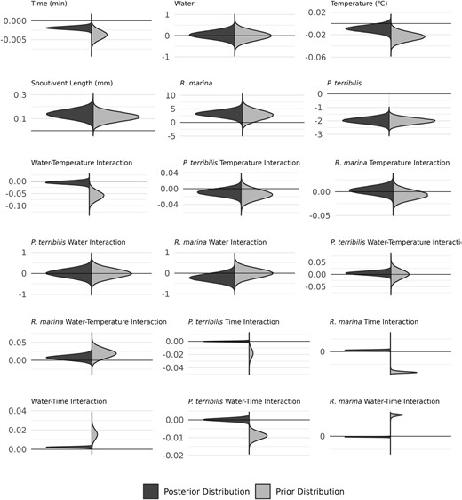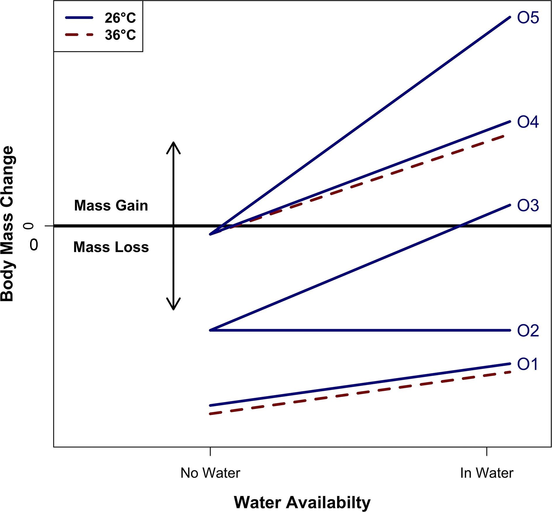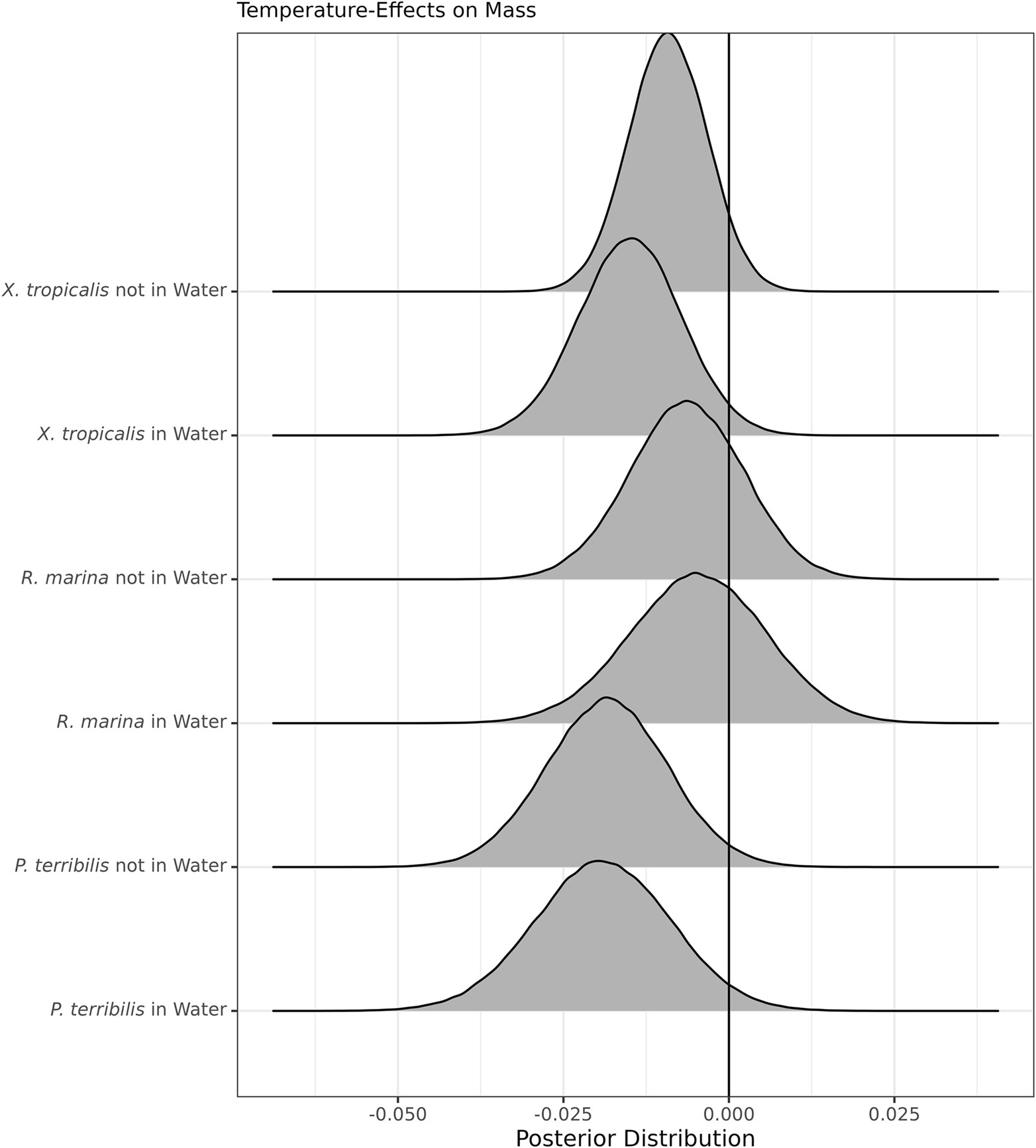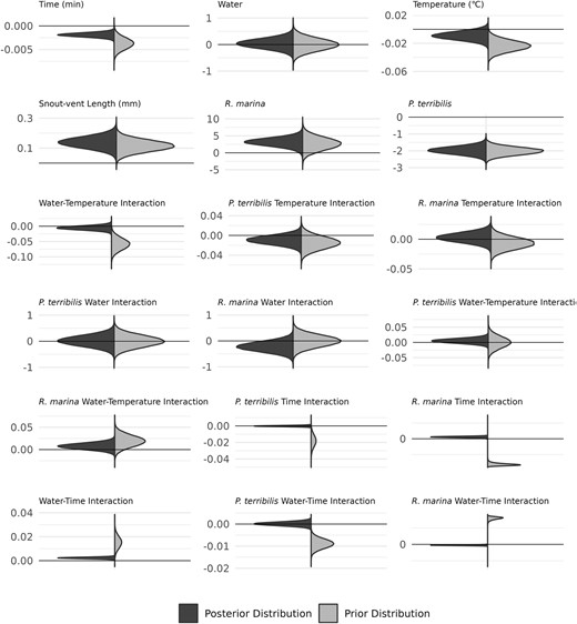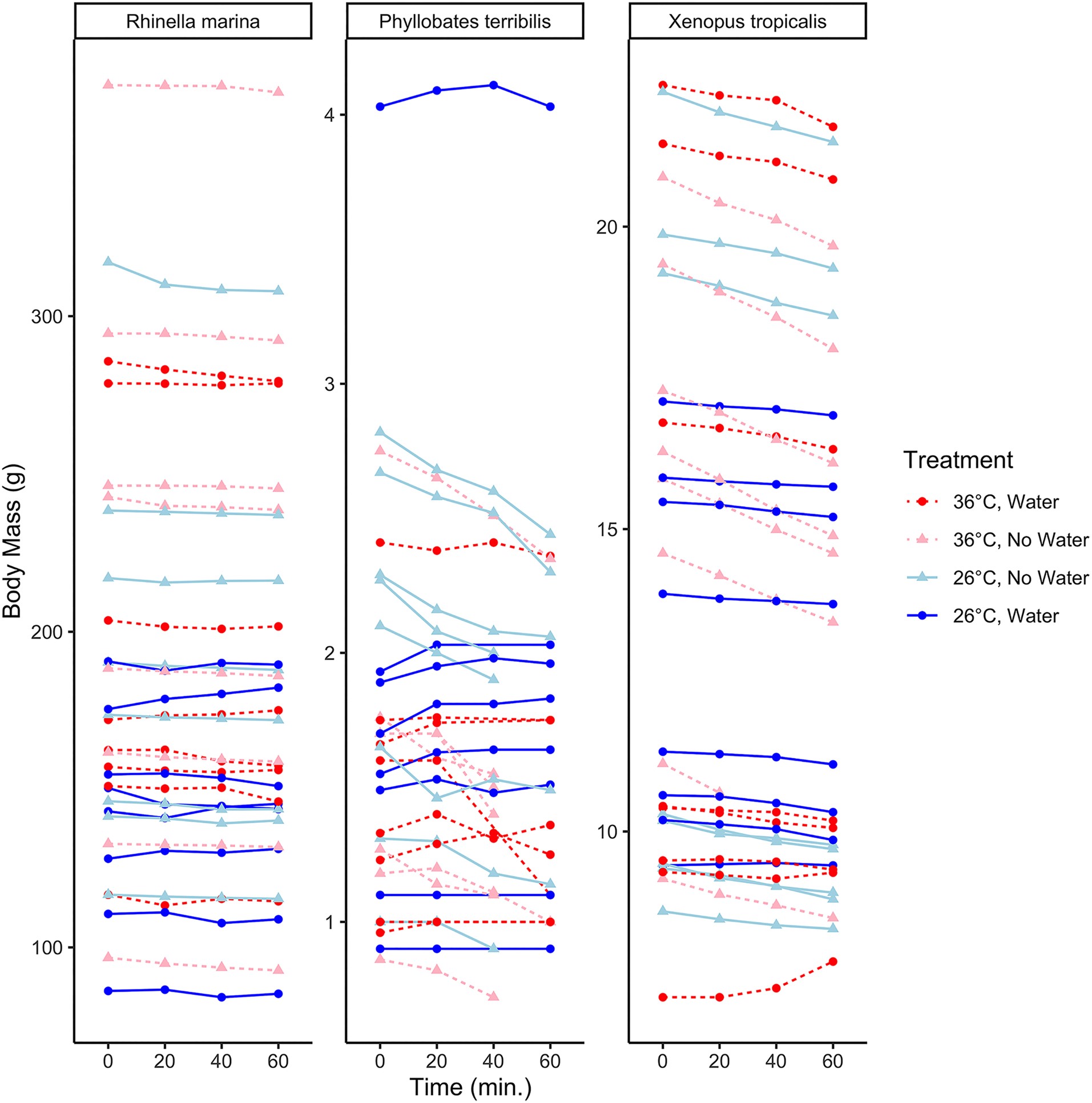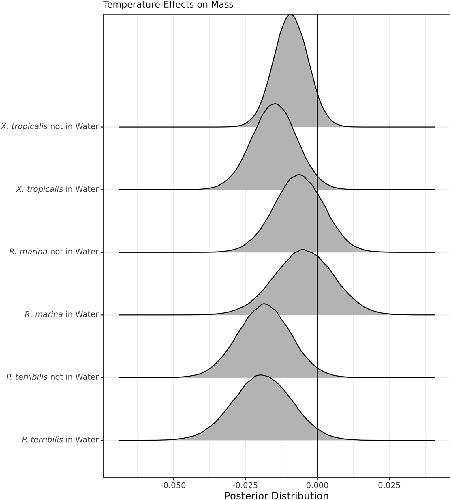 Water plays a notable role in the ecology of most terrestrial organisms due to the risks associated with water loss. Specifically, water loss in terrestrial animals happens through evaporation across respiratory tissues or the epidermis. Amphibians are ideal systems for studying how abiotic factors impact water loss since their bodies often respond quickly to environmental changes. While the effect of temperature on water loss is well known across many taxa, we are still learning how temperature in combination with humidity or water availability affects water loss. Here, we tested how standing water sources (availability) and temperature (26 and 36°C) together affect water loss in anuran amphibians using a Bayesian framework. We also present a conceptual model for considering how water availability and temperature may interact, resulting in body mass changes. After accounting for phylogenetic and time autocorrelation, we determined how different variables (water loss and uptake rates, temperature, and body size) affect body mass in three species of tropical frogs (Rhinella marina, Phyllobates terribilis, and Xenopus tropicalis). We found that all variables impacted body mass changes, with greater similarities between P. terribilis and X. tropicalis, but temperature only showed a notable effect in P. terribilis. Furthermore, we describe how the behavior of P. terribilis might affect its water budget. This study shows how organisms might manage water budgets across different environments and is important for developing models of evaporative water loss and species distributions.