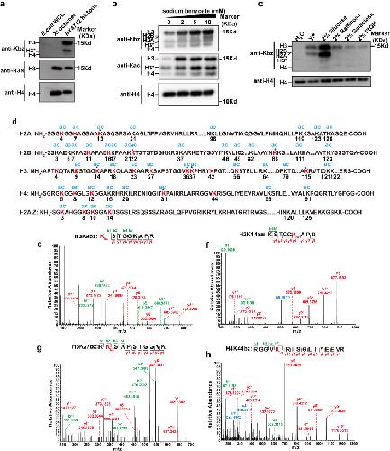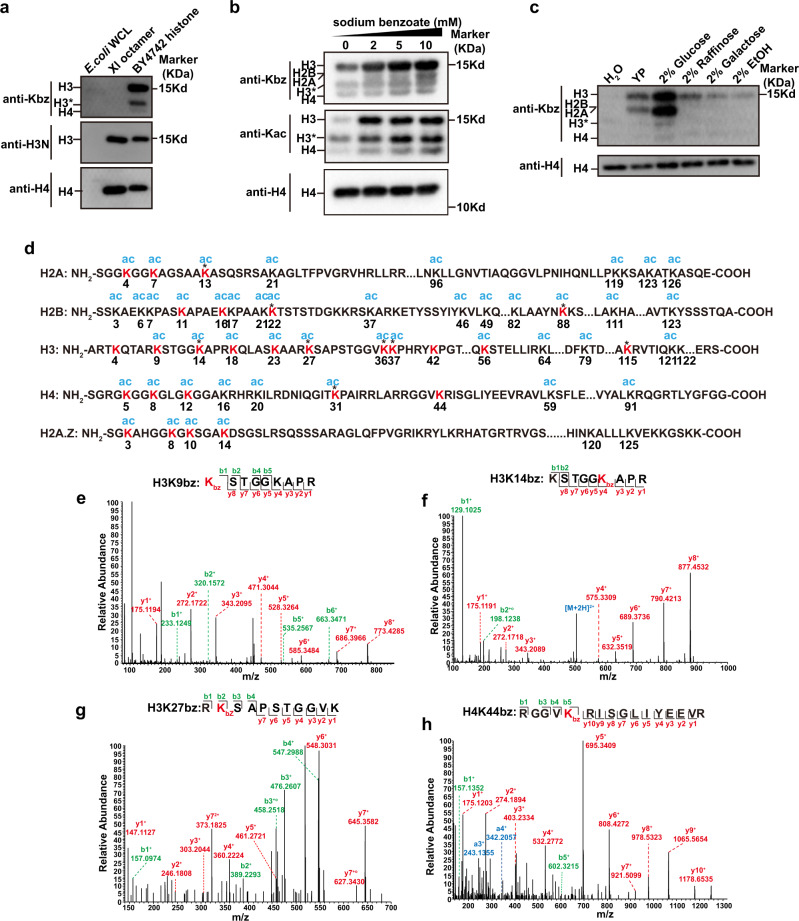Fig. 1. Identification of histone Kbz in yeast.a Detection of the Kbz signals from core histones extracted from BY4742 yeast cells. The specificity of pan anti-Kbz was confirmed because it did not recognize any band from the E.coli whole-cell lysate (E.coli WCL) or recombinant Xenopus laevis histone octamer (Xl octamer) purified from E.coli. The H3* represents clipping H3. Source data for panels a–c are provided in the Source Data file. b Sodium benzoate treatment significantly enhanced the Kbz and Kac levels on yeast histones in a dose-dependent manner. BY4742 cells were grown in YPD to log phase, and then sodium benzoate was added into the medium for 6 h, followed by extraction of histones and western blotting analysis. c The level of histone Kbz was regulated by the type of carbohydrate. BY4742 cells were grown in standard medium with 2% glucose to log phase and then transferred to H2O or other indicated mediums for 4 h, followed by extraction of histones and western blotting analysis. d Illustrations of all Kbz sites identified on core histones extracted from yeast cells treated with 10 mM sodium benzoate. The detected Kbz sites are shown in red. Nine Kbz sites detected in samples without sodium benzoate treatment are labeled by asterisks. Most Kbz sites overlap with the known Kac sites, except for H3K42, H3K115, and H4K44. e–h: MS/MS spectra of H3 and H4 peptides bearing Kbz modification. (e) H3K9; (f) H3K14; (g) H3K27; (h) H4K44. Predicted b- and y-type ions are listed above and below the peptide sequence, respectively. The circle symbol indicates the neutral loss of water. Matched ions are labeled in the spectra. |