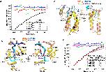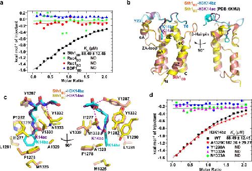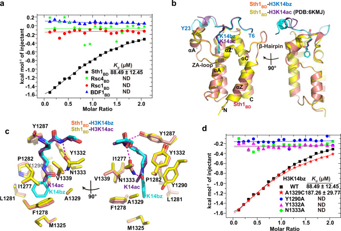 Fig. 6. Sth1 bromodomain has Kbz binding activity.a ITC analyses of four yeast bromodomains binding with H3K14bz peptides. Sth1BD exhibits a detectable interaction with the H3K14bz peptide (Kd = 89 μM). b Superimposition of Sth1BD-H3K14bz (Sth1:orange; H3, cyan) and Sth1BD-H3K14ac (Sth1: yellow; H3, purple) complexes shows almost identical conformations of Sth1BD and H3 peptide, except for the C-terminal 310-helix of H3. c Detailed interaction networks between acylated lysine and Sth1BD. Benzoyl and acetyl groups are shown in cyan and purple, respectively. Hydrophobic contacts and hydrogen-bonding networks are shown. d ITC assays showing the effects of Sth1 mutations on the interaction between Sth1BD and H3K14bz peptide. |