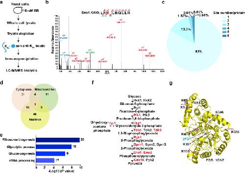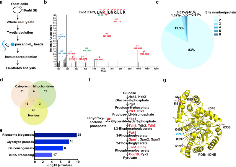 Fig. 7. Proteome-wide screening of Kbz-modified proteins in yeast cells.a The workflow used for HPLC–MS/MS-based non-histone Kbz sites identification in S. cerevisiae. b The MS/MS spectrum of an Eno1 peptide (LAK+104.0268LNQLLR) harboring one benzoylated site. Predicted y- and b-type ions are listed above and below the peptide sequence, respectively. Matched ions are labeled in the spectra. c Distribution of non-histone Kbz sites based on the site number per protein. d Venn diagram showing the subcellular compartment distribution of non-histone Kbz proteins. e Gene ontology analysis associated with significant regulated genes (P < 0.05) of non-histone Kbz proteins. P values are derived from one-sided Fisher’s exact test. f Overview of glycolysis pathway. The enzymes with identified benzoylation sites are shown in red. g Eight benzoylation sites on Eno1 are shown in the structural model of Eno1 (PDB: 1ONE). The Eno1 substrate, 2-phosphoglycerate, is shown in cyan. K346, K397, and K409 are adjacent to the substrate-binding pocket. |