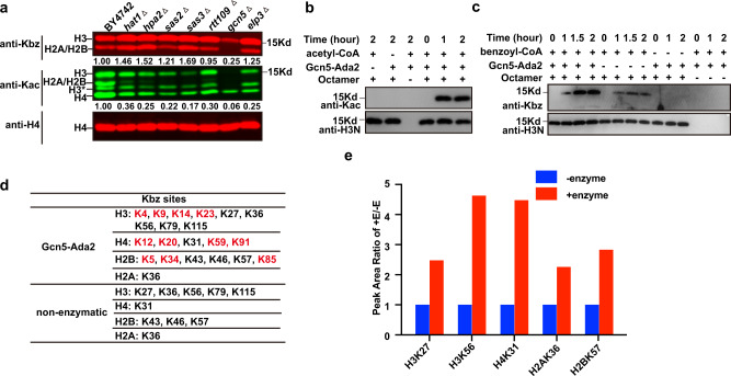 Fig. 2. Gcn5-containing complex is a histone benzoyltransferase.a Fluorescence quantitative western blot analysis comparing the Kbz and Kac levels in WT (BY4742) and HAT-deletion strains. Total H4 was used as the loading control. The fluorescence signals from mutant strains were normalized by setting the WT fluorescence signal to 1.0 and were labeled in the image. Source data for panels (a–c) are provided in the Source Data file. b The Ada2-Gcn5 subcomplex could catalyze acetylation of the histone octamer in vitro. The reaction products were detected by western blot analysis using a pan-Kac antibody. c Histone benzoylation can occur by enzymatic and non-enzymatic mechanisms. The reaction products in different combinations were detected by western blot analysis using a pan-Kbz antibody. d The list of LC-MS/MS-identified histone benzoylation sites deposited by the non-enzymatic mechanism and by Gcn5-Ada2. The unique sites catalyzed by Gcn5-Ada2 are labeled red. e Gcn5-Ada2 catalyzed histone benzoylation more efficiently than spontaneous reaction. The Y-axis represents the ratio of MS/MS peak areas under enzymatic and non-enzymatic conditions. This result is from a single experiment. |
