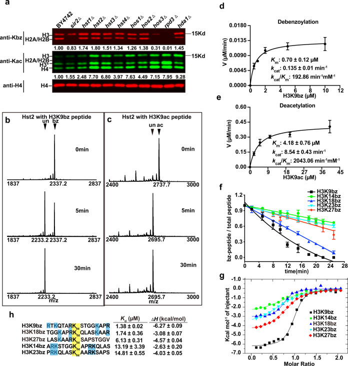 Fig. 3. Hst2 is a histone debenzoylase.a Fluorescence quantitative western blot analysis comparing the Kbz and Kac levels in WT (BY4742) and ten HDAC-deletion strains. The fluorescence signals from mutant strains were normalized by setting the WT fluorescence signal to 1.0 and were labeled in the image. The H3* represents clipping H3. Source data are provided in the Source Data file. b Debenzoylase activity of Hst2FL protein (2 μM) with H3K9bz peptide (10 μM) shown by the representative MALDI-TOF spectra at 0, 5, and 30 min. The peaks for H3K9bz (bz, m/z 2,337) and unmodified (un, m/z 2,233) products are labeled. c Deacetylase activity of Hst2FL protein (0.5 μM) with H3K9ac peptide (10 μM) shown by the representative MALDI-TOF spectra at 0, 5, and 30 min. The peaks for H3K9ac (ac, m/z 2,737) and unmodified (un, m/z 2695) products are labeled. d The Michaelis-Menten plot for Hst2 fixed at 0.1 μM with varied H3K9bz peptide concentrations. Data are presented as mean ± SD, n = 3 biological independent measurements. Source data for panels (d, e) are provided in the Source Data file. e The Michaelis–Menten plots for Hst2 fixed at 0.05 μM with varied H3K9ac peptide concentrations. Data are presented as mean ± SD, n = 3 biological independent measurements. f Hst2-mediated debenzoylation reaction monitored by time-resolved MALDI-TOF mass spectrometry. The Y-axis represents the percentage of Kbz peptide in total peptides calculated from the MALDI-TOF spectra. Data are presented as mean ± SD, n = 3 biological independent measurements. Source data are provided in the Source Data file. g ITC binding curves for Hst2 interaction with different Kbz peptides. h Sequence alignment of benzoylated H3 peptides used in the current study. The alignment is centered on the target lysine (yellow). Positively charged R/K residues are shown in blue. The dissociation constants (Kd) and enthalpy changes (ΔH) derived from the ITC assay (panel g) are shown. |
