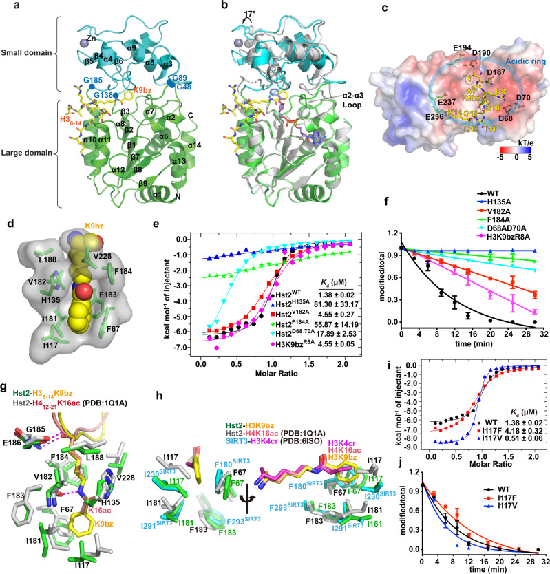 Fig. 4. The structural basis for H3K9bz recognition by Hst2.a The overall structure of the Hst28-294–H36-14K9bz complex. The large domain and small domain in Hst2 are shown in green and cyan, respectively. H3K9bz peptide is presented as a stick model (yellow). Four glycine residues located at the junctions between the large and small domains are labeled. b Superimposition of Hst2-H3K9bz and Hst2-2′-O-benzoyl-ADP-ribose complexes indicates the relative 17° rotation of the small domain and the rearrangement of the α2-α3 loop. The large domain and small domain in the Hst2-H3K9bz complex are shown in green and cyan, respectively. Hst2 in the Hst2-2′-O-benzoyl-ADP-ribose complex is shown in gray. The cofactor product 2′-O-benzoyl-ADP-ribose is shown in slate. c The interface between Hst2 and H3 peptide. Hst2 is shown as a surface model colored according to its electrostatic potential (positive potential: blue; negative potential, red). H3 residues from T6 to K14 are shown in yellow stick models. An acidic ring formed by a series of acidic residues is labeled. d The H3K9bz binding pocket of Hst2. The side chain of K9bz (shown as a ball model) is inserted into a relatively hydrophobic tunnel of Hst2. e ITC measurements reveal that Hst2 mutations and H3K9bzR8A weaken the Hst2–H3K9bz interaction. The dissociation constant (Kd) and their fitting errors are shown. f MALDI-TOF-based debenzoylase assays show that Hst2 mutations and H3K9bzR8A decrease the debenzoylase activity of Hst2. Data are presented as mean ± SD, n = 3 biological independent measurements. Source data are provided in the Source Data file. g Comparison of the almost identical Kbz and Kac-binding pockets in Hst2-H3K9bz and Hst2-H4K16ac (PDB: 1Q1A) structures. H3K9bz is shown in yellow, and H4K16ac is shown in red. Hydrogen bonds are shown as magenta dashed lines. h Comparison of the acyl-group binding pockets by superimposition of Hst2-H3K9bz, Hst2-H4K16ac, and SIRT3-H3K4cr structures. The benzoyl, acetyl, and crotonyl groups are surrounded by four conserved hydrophobic residues. i ITC results reveal that Hst2 I117F and I117V mutants decrease and increase binding with H3K9bz peptides, respectively. The dissociation constant (Kd) and their fitting errors are shown. j MALDI-TOF-based debenzoylase assays show that Hst2 I117F and I117V mutants decrease and increase debenzoylase activities on H3K9bz peptides, respectively. Data are presented as mean ± SD, n = 3 biological independent measurements. Source data are provided in the Source Data file. |